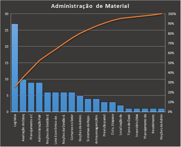 2) Administração de Material Em Administração de Material, nos baseamos neste caderno: https://www.tecconcursos.com.br/s/Q2DtBh, contendo 105 questões. Usamos como filtro questões de nível superior da banca AOCP e da banca Instituto AOCP. Veja como ficou a distribuição.