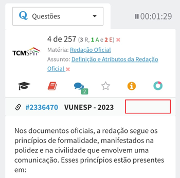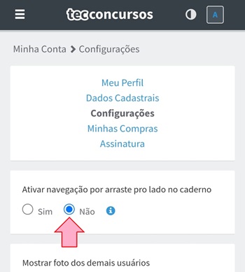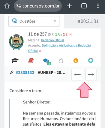 Por padrão, as "setas" superiores não são exibidas porque agora é possível navegar entre as questões arrastando a tela de seu dispositivo (para a esquerda ou para a direita):