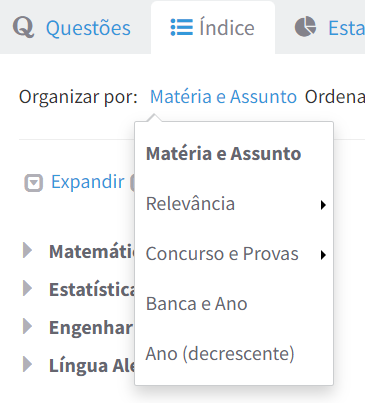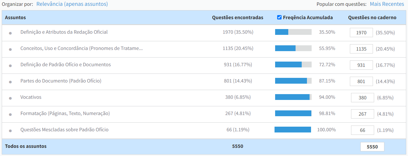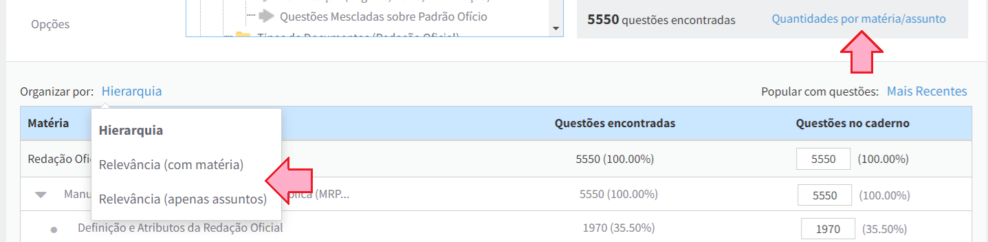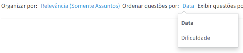 No caso, selecionados o organizar por relevância (somente assuntos), em cada tópico dos assuntos daquele caderno poderemos exibir as questões em ordem de data (mais recentes para a menos recentes) ou dificuldade (mais fáceis para as mais difíceis).