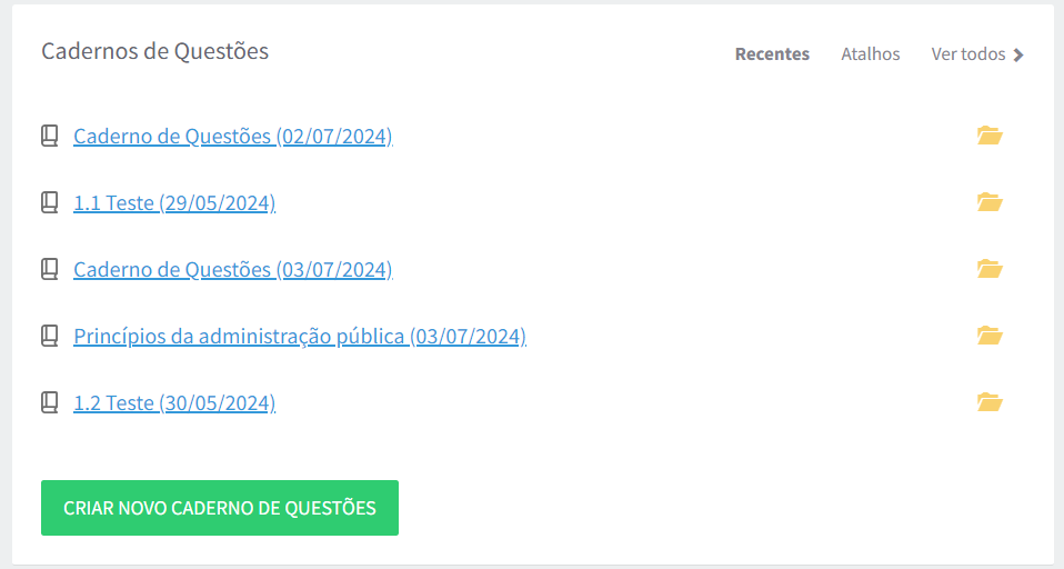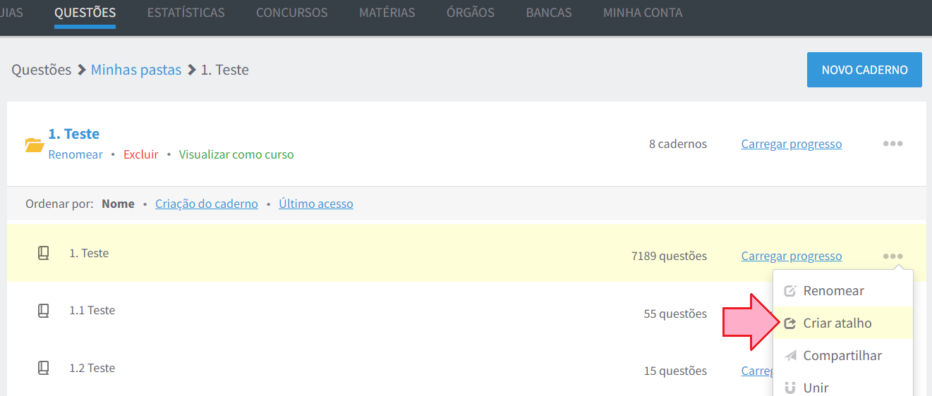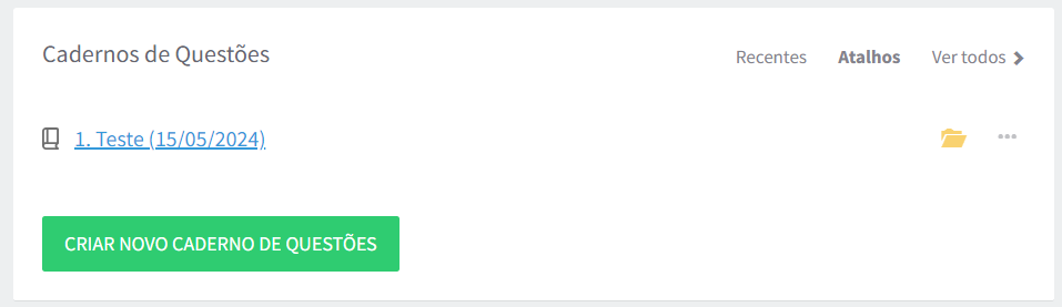 Acessar o caderno desejado na listagem (Menu questões -> Pastas -> lista de cadernos da pasta) e, nesta tela, marcar o botão abaixo: