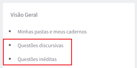 Colocamos, também, no lado direito da home, atalhos adicionais para questões inéditas e questões discursivas no Tec: