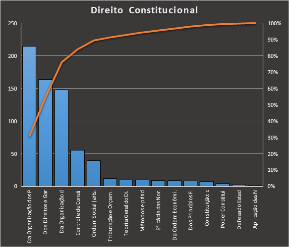 1) Direito Constitucional Em Direito Constitucional, nos baseamos neste caderno: https://www.tecconcursos.com.br/s/Q2Aeik, contendo 693 questões. Usamos como filtro questões das áreas jurídica e judiciária da banca FGV. O resultado está na tabela abaixo. Destacados de azul nessa tabela estão 3 tópicos cuja porcentagem acumulada é de 76%. Isso significa que apenas 3 tópicos cobrem 76% de todas as questões da matéria que obedecem aos filtros utilizados. Segue a distribuição: