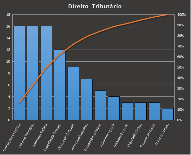 3) Direito Tributário O caderno base, https://www.tecconcursos.com.br/s/Q2Aeio, contou com 96 questões. Usamos como filtro questões das áreas jurídica e judiciária da banca FGV. Segue abaixo a distribuição, sendo estes3 tópicos mais cobrados: "Limitações Constitucionais ao Poder de Tributar", "Crédito Tributário" e "Impostos Federais, Estaduais e Municipais". Estes três tópicos somam metade de todas as questões.