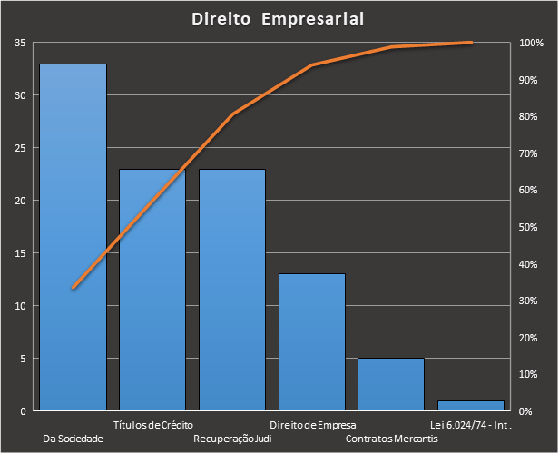 11) Direito Empresarial Para esta matéria nos baseamos neste caderno: https://www.tecconcursos.com.br/s/Q2Aeo5, contendo 98 questões. Usamos como filtro questões das áreas jurídica e judiciária da banca FGV, resultando na seguinte distribuição: