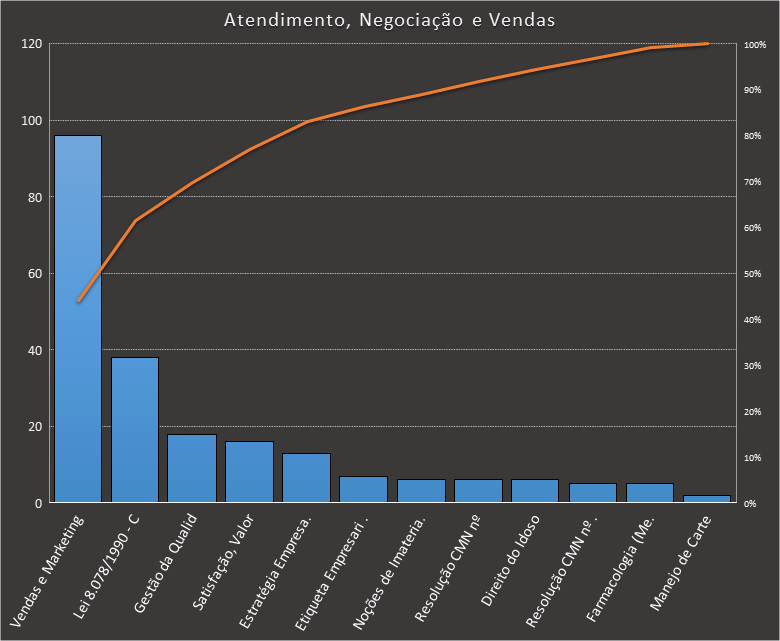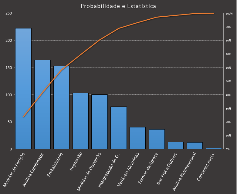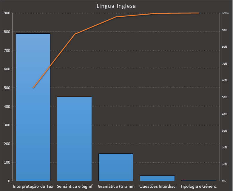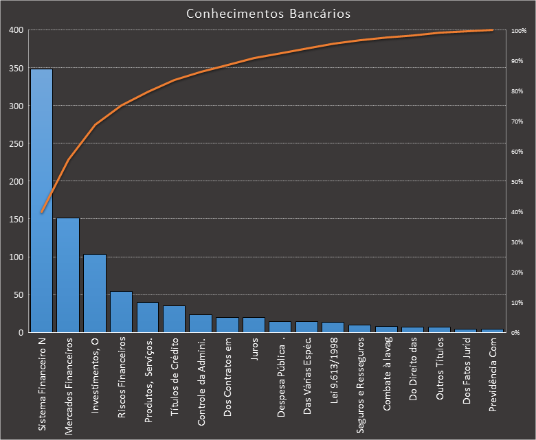 Em todas as tabelas deste artigo destacamos de cor azul os assuntos que atingem porcentagem acumulada de 70%. Para esta matéria em específico, temos destacados de azul 6 tópicos cuja porcentagem acumulada é de 75%. Isso significa que apenas 6 assuntos cobrem 75% de todas as questões da matéria que obedecem aos filtros utilizados. Segue a distribuição.