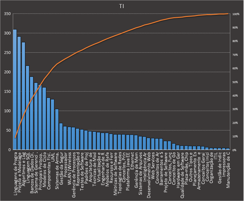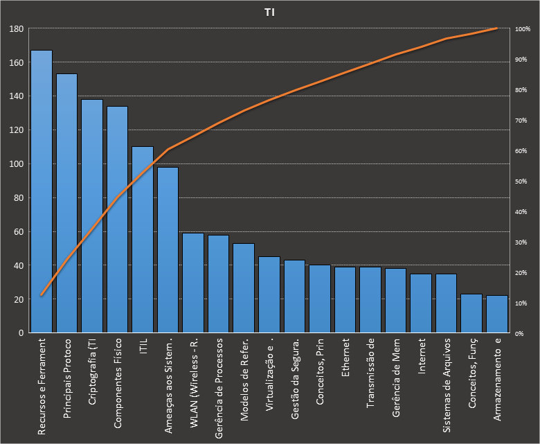 Em TI, nos baseamos neste caderno, contendo 3.417 questões. Usamos como filtros questões elaboradas pela CESGRANRIO. Veja como ficou a distribuição.