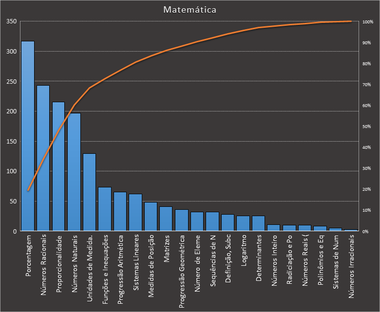 Para esta matéria nos baseamos neste caderno, contendo 1.615 questões. Usamos como filtros questões elaboradas pela CESGRANRIO. Como resultado, porcentagem, números racionais e proporcionalidade (o que inclui regra de três) somam praticamente metade de todas as questões (porcentagem acumulada de 48%):