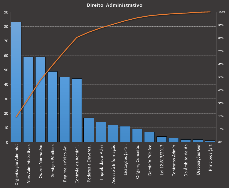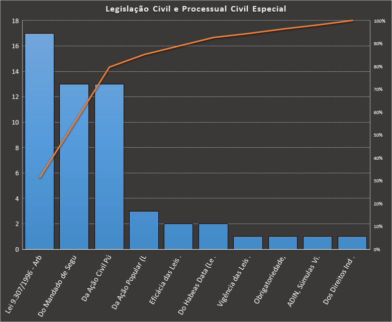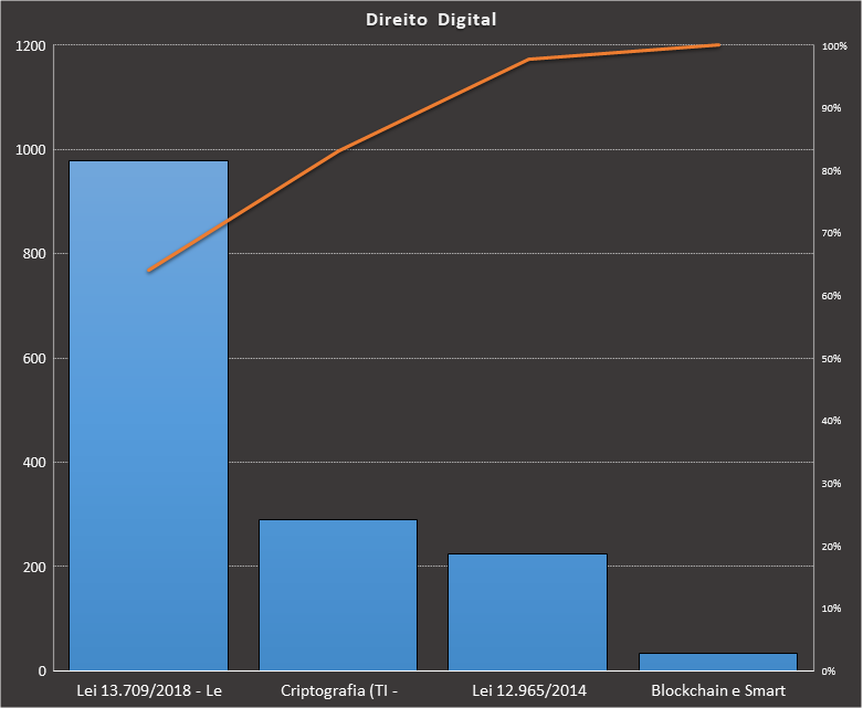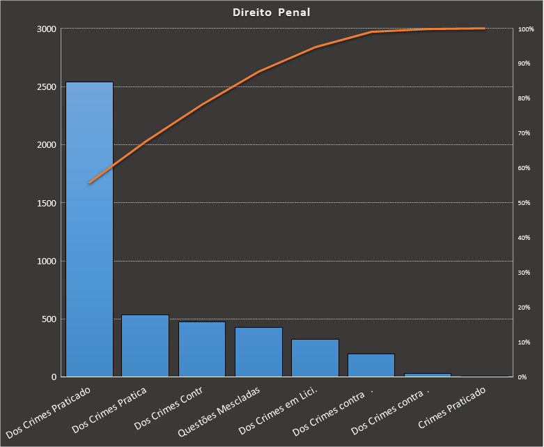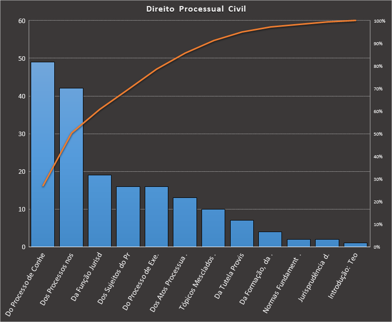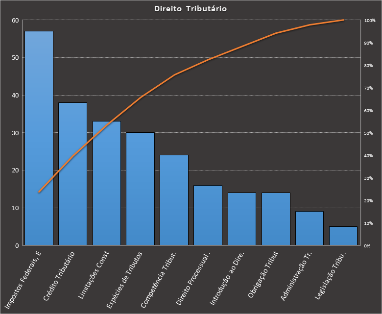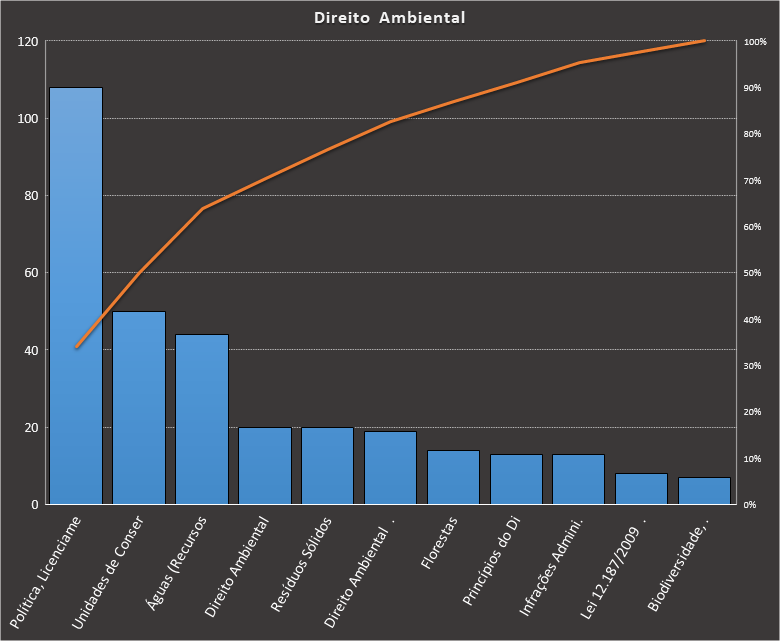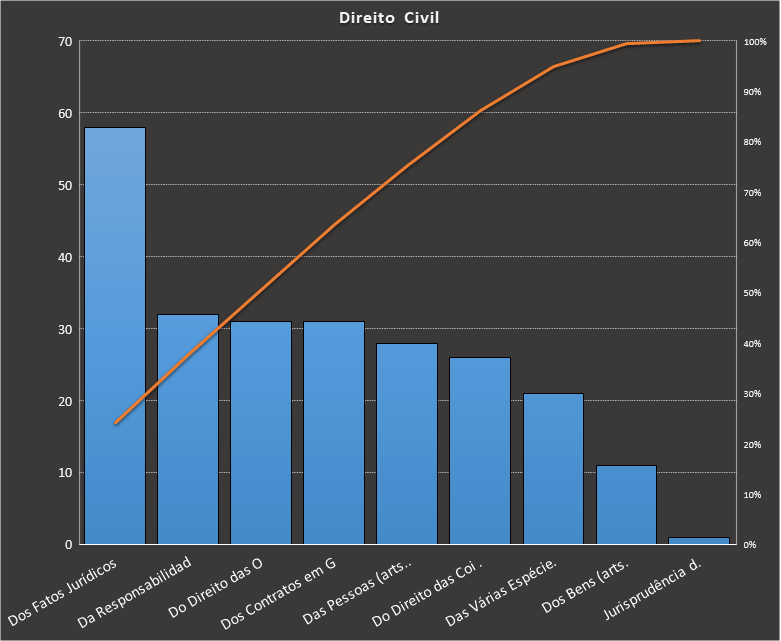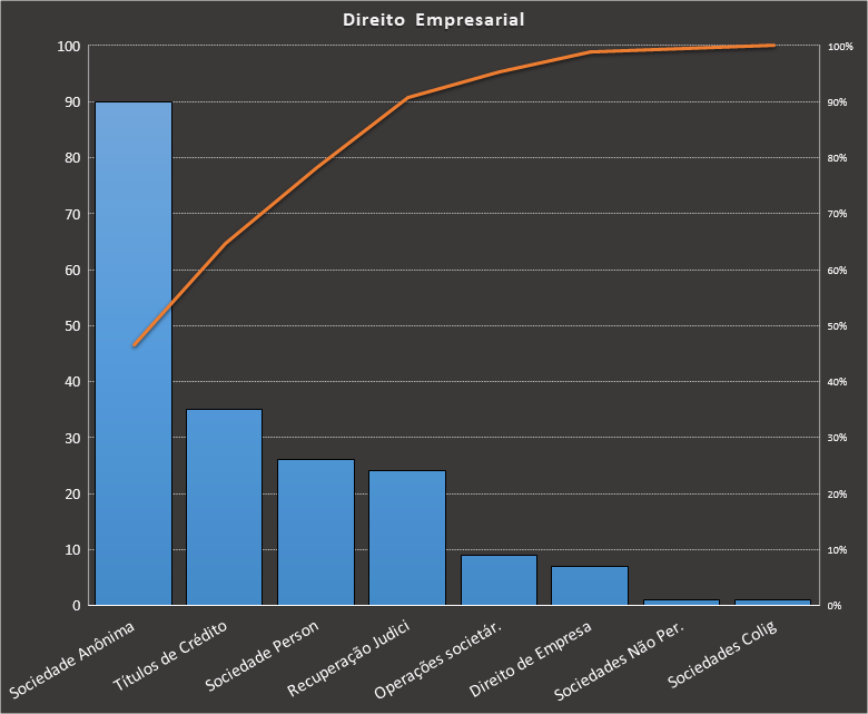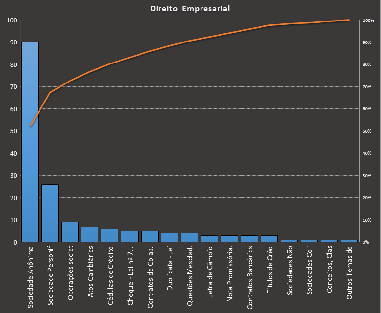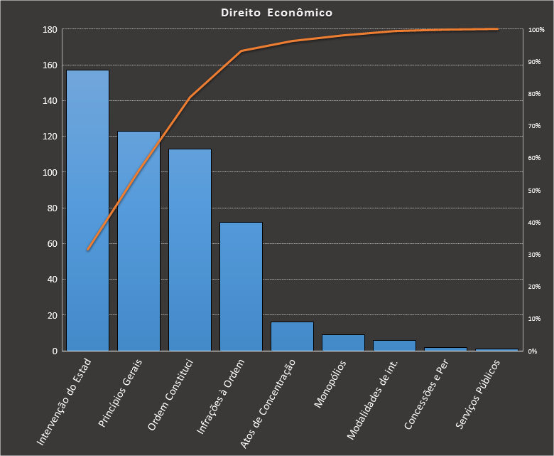 Em todas as tabelas deste artigo destacamos de cor azul os assuntos que atingem porcentagem acumulada de 70%. Para esta matéria em específico, temos destacados de azul 6 tópicos cuja porcentagem acumulada é de 75%. Isso significa que apenas 6 assuntos cobrem 75% de todas as questões da matéria que obedecem aos filtros utilizados. Segue a distribuição.