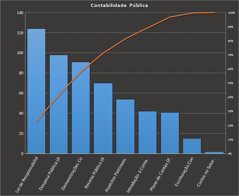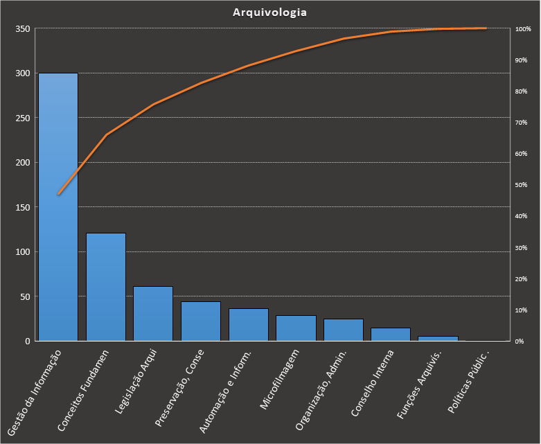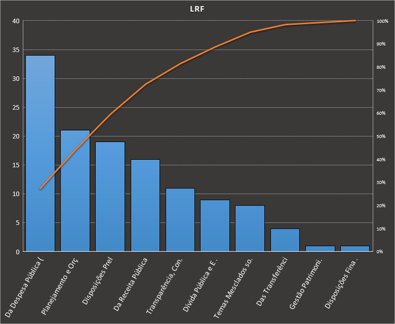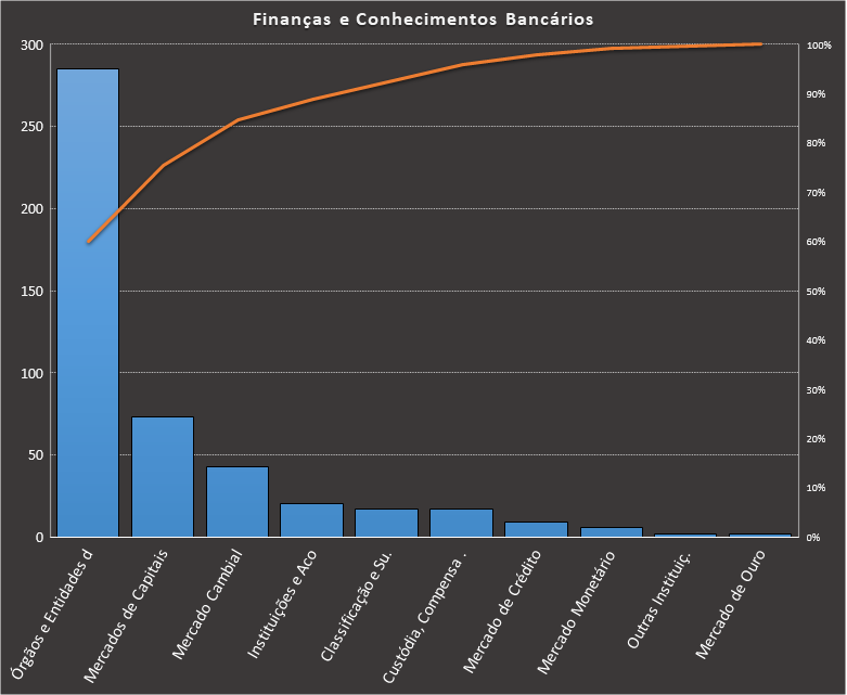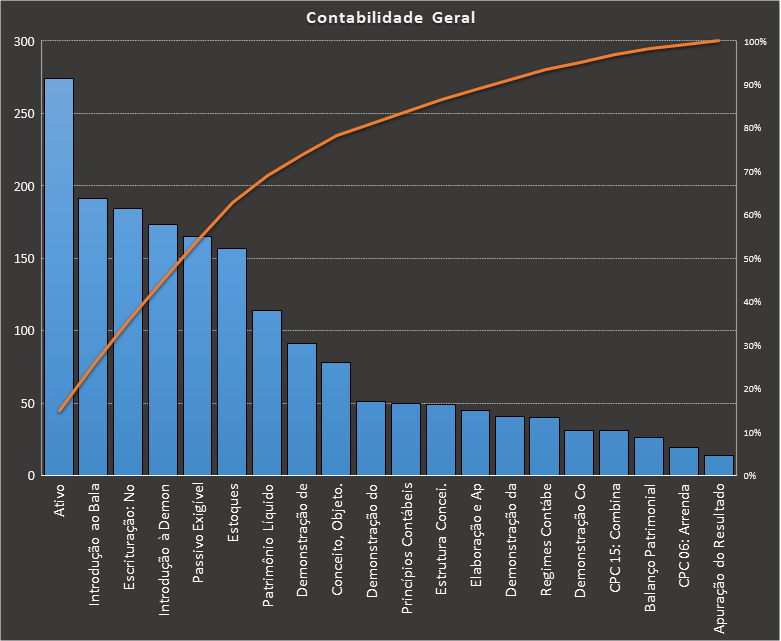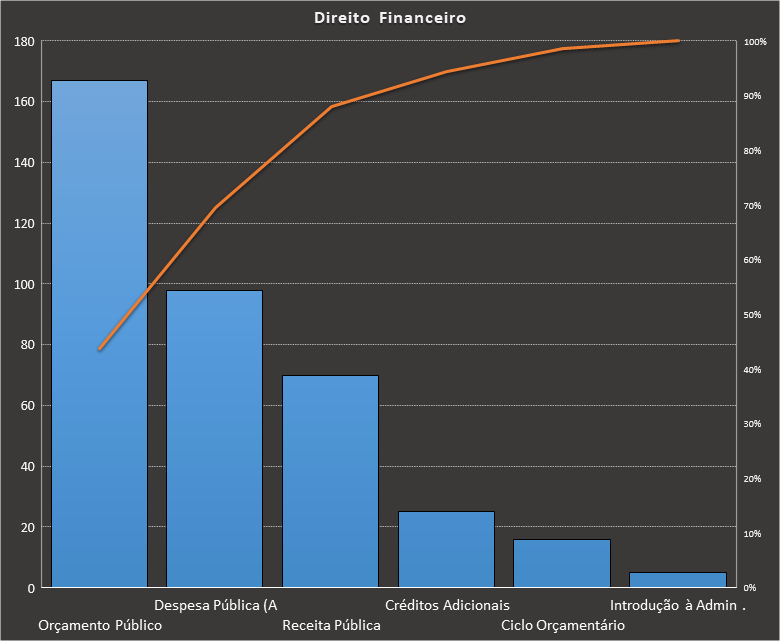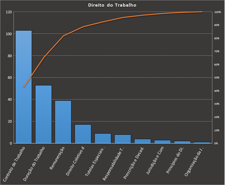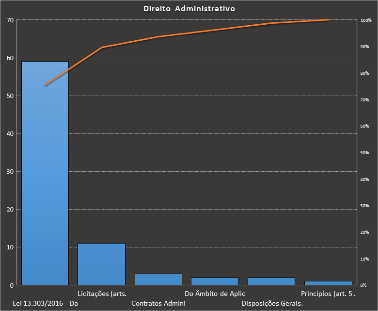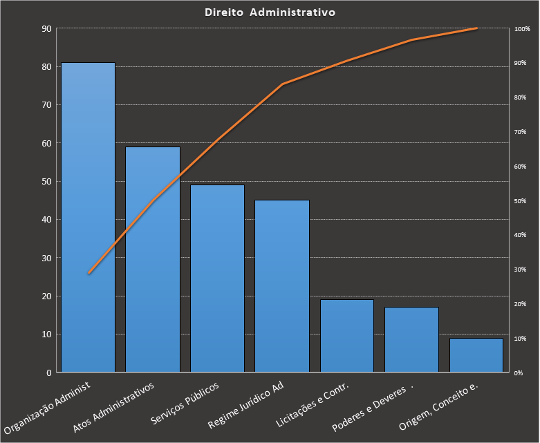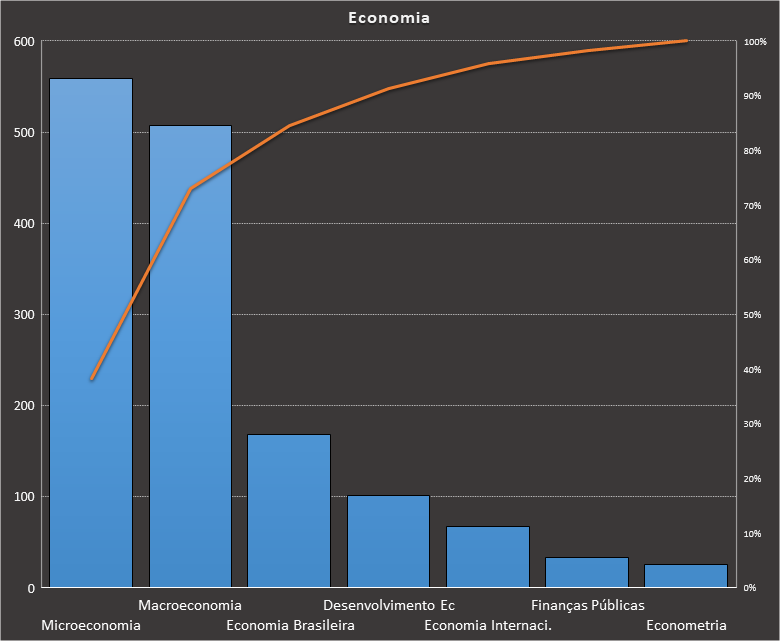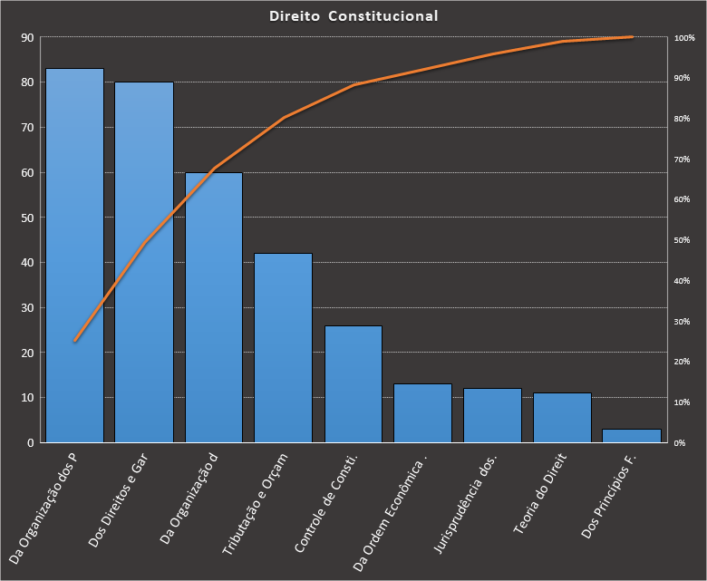 Em todas as tabelas deste artigo destacamos de cor azul os assuntos que atingem porcentagem acumulada de 70%. Para esta matéria em específico, temos destacados de azul 6 tópicos cuja porcentagem acumulada é de 75%. Isso significa que apenas 6 assuntos cobrem 75% de todas as questões da matéria que obedecem aos filtros utilizados. Segue a distribuição.