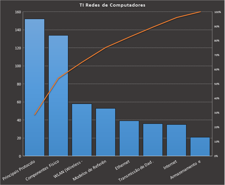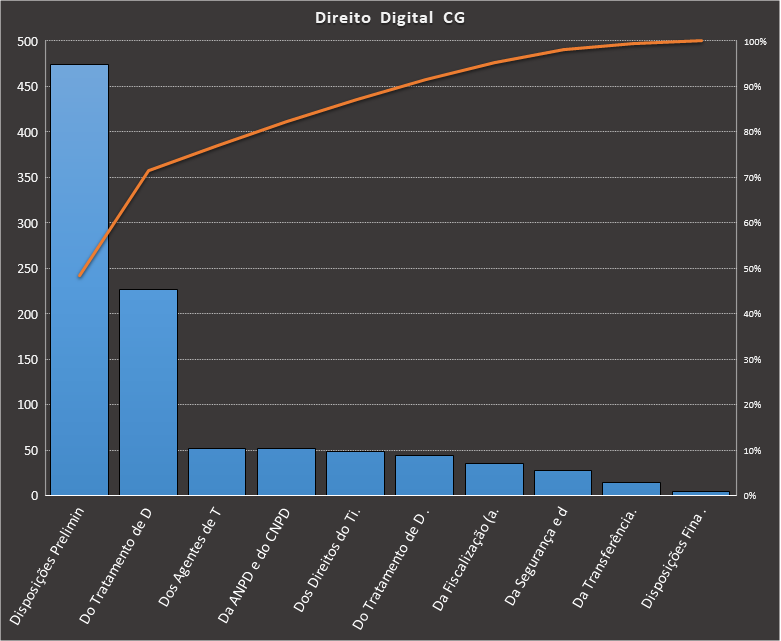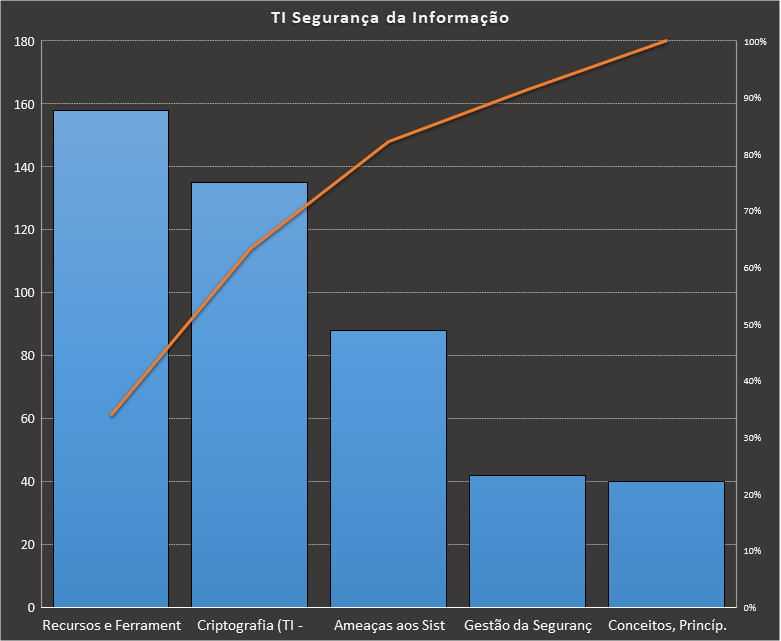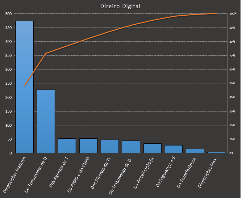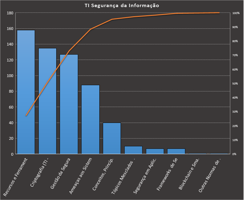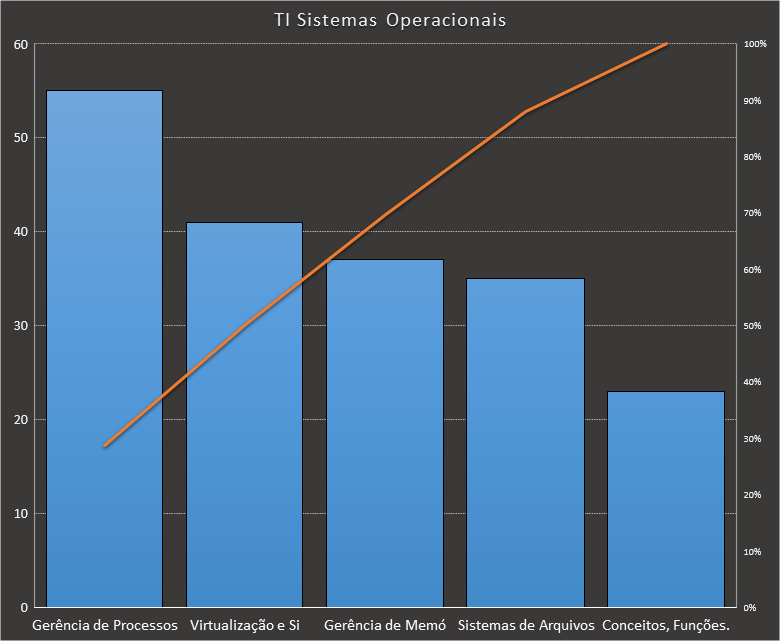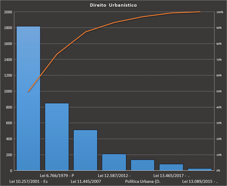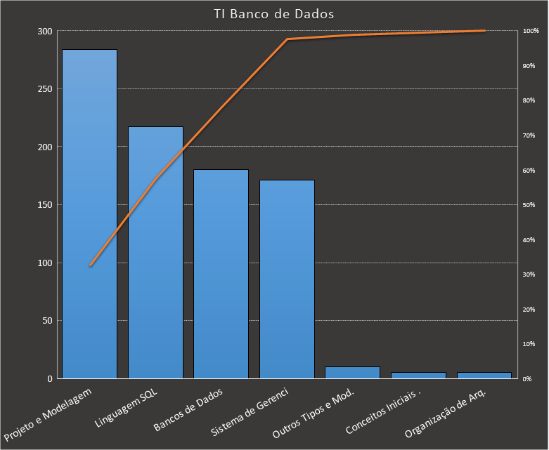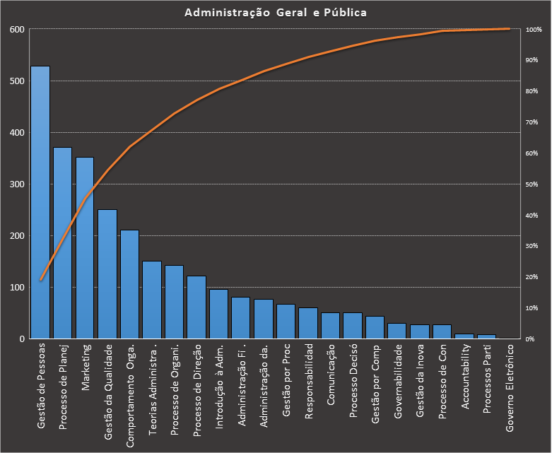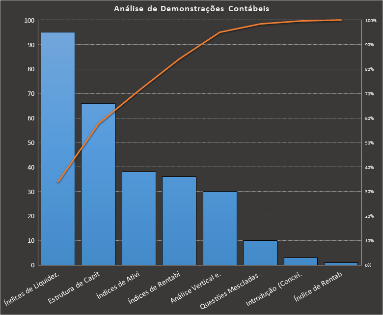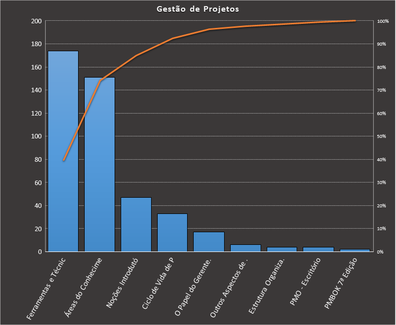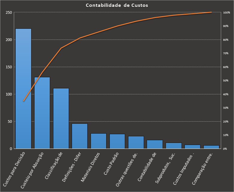 Em todas as tabelas deste artigo destacamos de cor azul os assuntos que atingem porcentagem acumulada de 70%. Para esta matéria em específico, temos destacados de azul 6 tópicos cuja porcentagem acumulada é de 75%. Isso significa que apenas 6 assuntos cobrem 75% de todas as questões da matéria que obedecem aos filtros utilizados. Segue a distribuição.