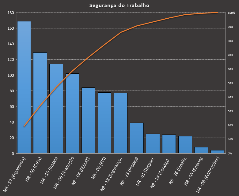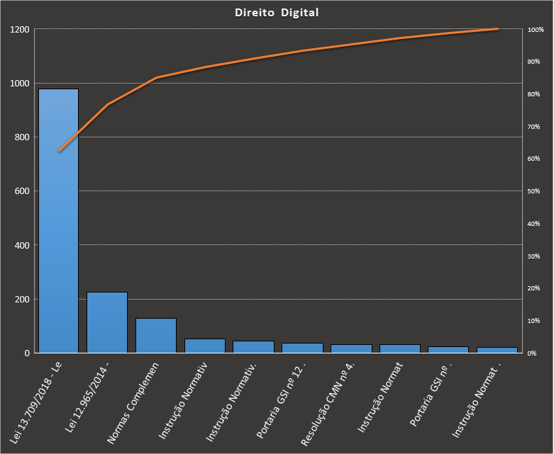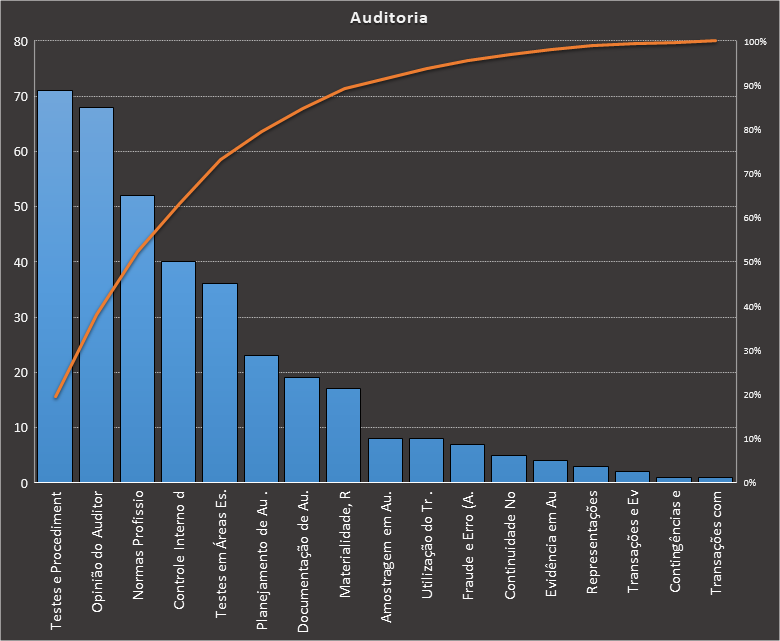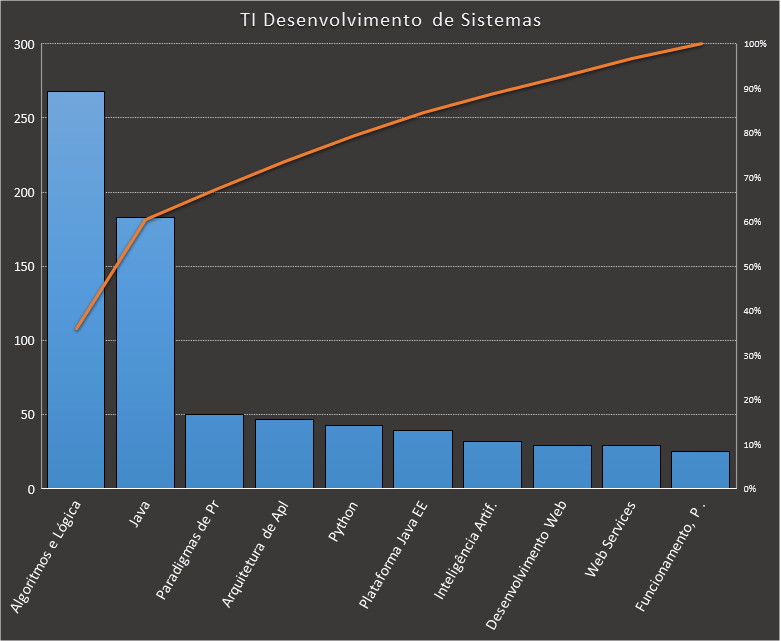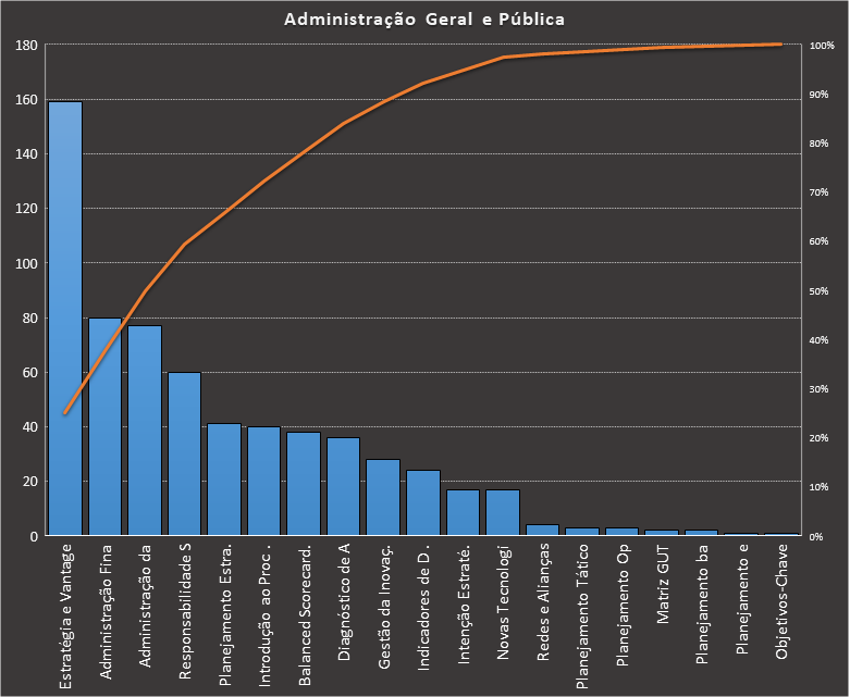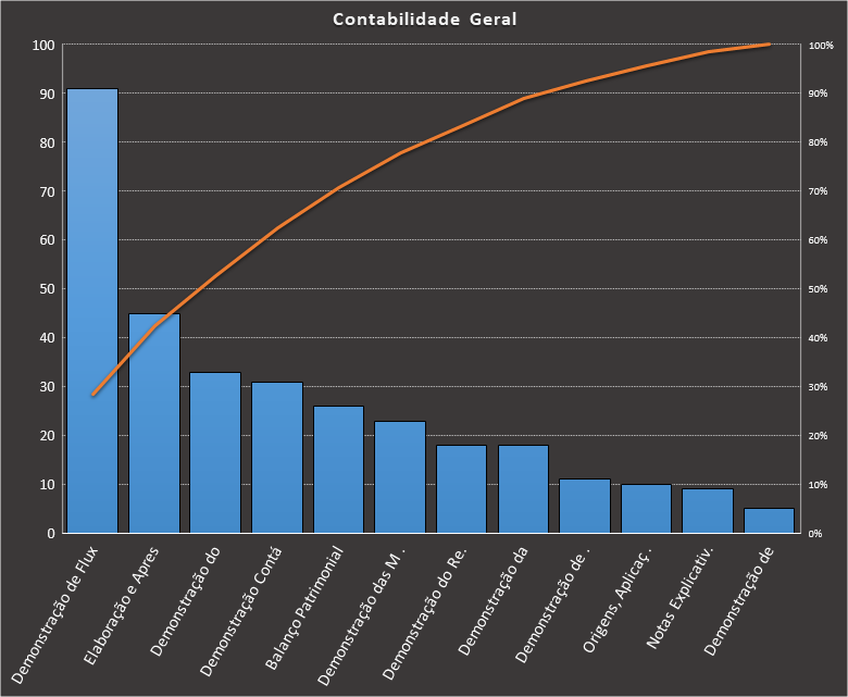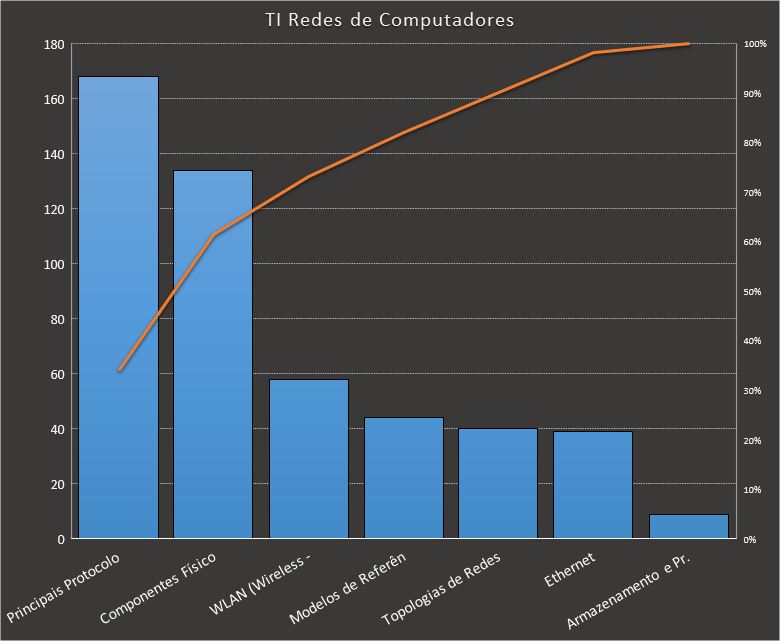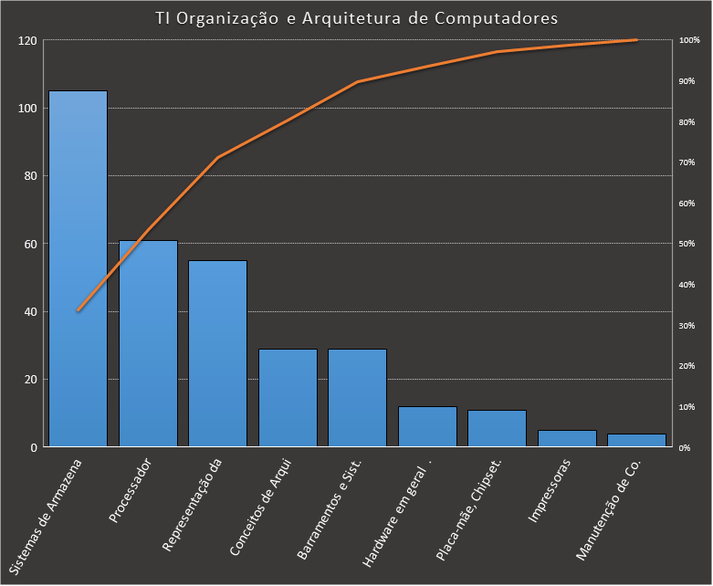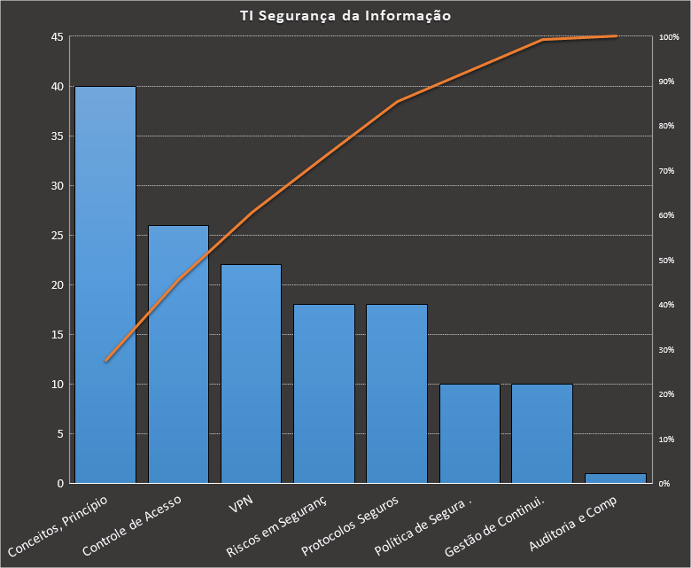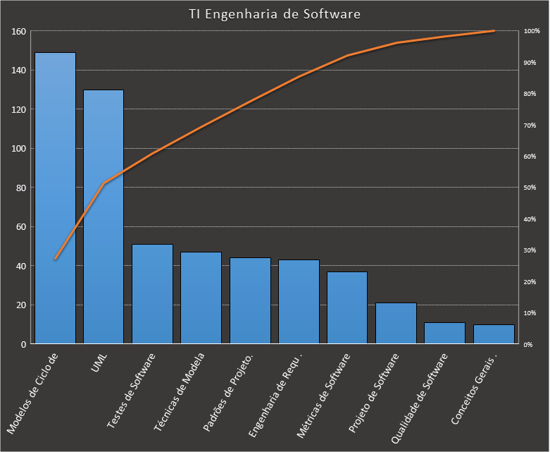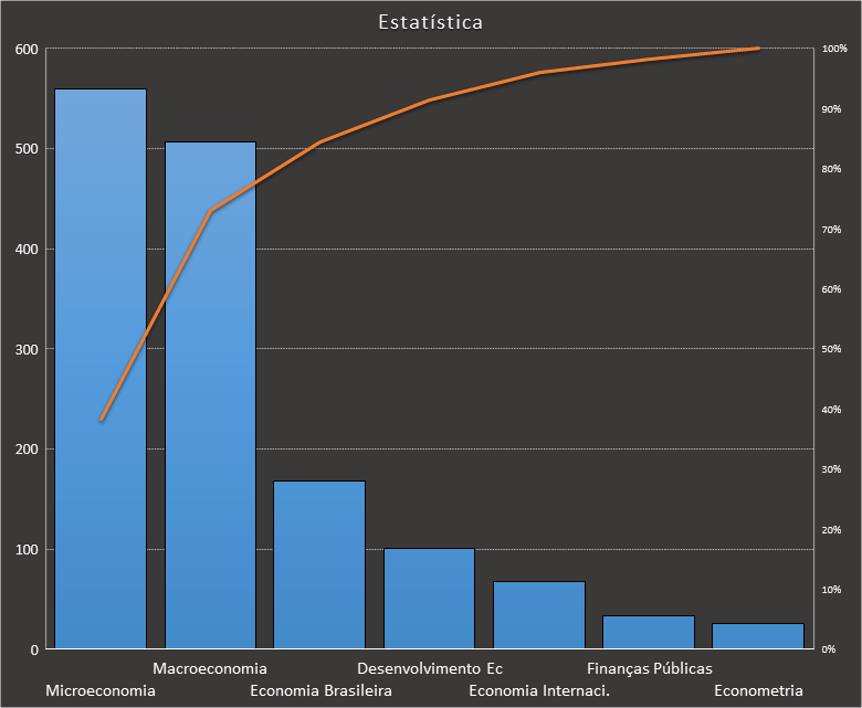 Em todas as tabelas deste artigo destacamos de cor azul os assuntos que atingem porcentagem acumulada de 70%. Para esta matéria em específico, temos destacados de azul 6 tópicos cuja porcentagem acumulada é de 75%. Isso significa que apenas 6 assuntos cobrem 75% de todas as questões da matéria que obedecem aos filtros utilizados. Segue a distribuição.