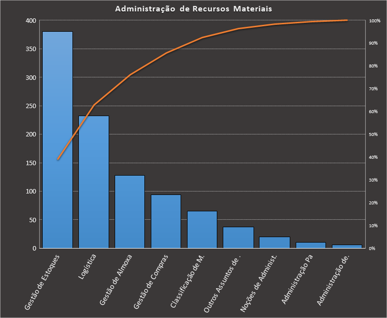 O caderno base contou com 316 questões. Usamos como filtro questões de concursos elaboradas pela banca CESGRANRIO. A distribuição é esta: