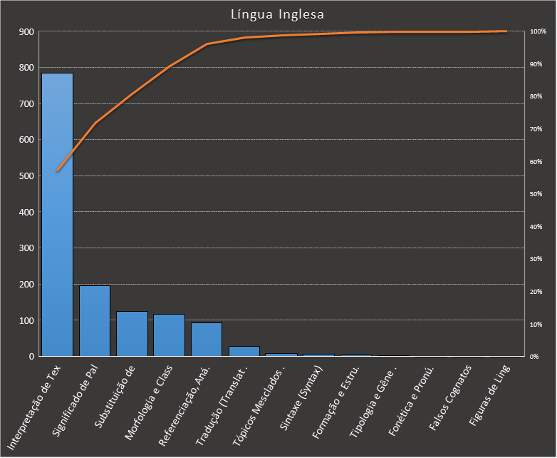 Em Língua Inglesa, nos baseamos neste caderno, contendo 1.366 questões. Usamos como filtro questões de concursos elaboradas pela banca CESGRANRIO. Veja abaixo que "interpretação de textos (understanding)" contém 57% das questões, ou seja, um único assunto representa mais da metade de todas as questões. Evidencia-se um empenho primordial no estudo desse tópico. Sugerimos resolução em massa de questões comentadas de provas anteriores da banca sobre esse tema.