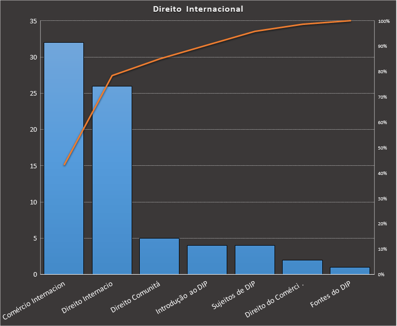 Em Direito Internacional, nos baseamos neste caderno, contendo 74 questões. Usamos como filtro questões de concursos elaboradas pela banca CESGRANRIO. Veja como ficou a distribuição.