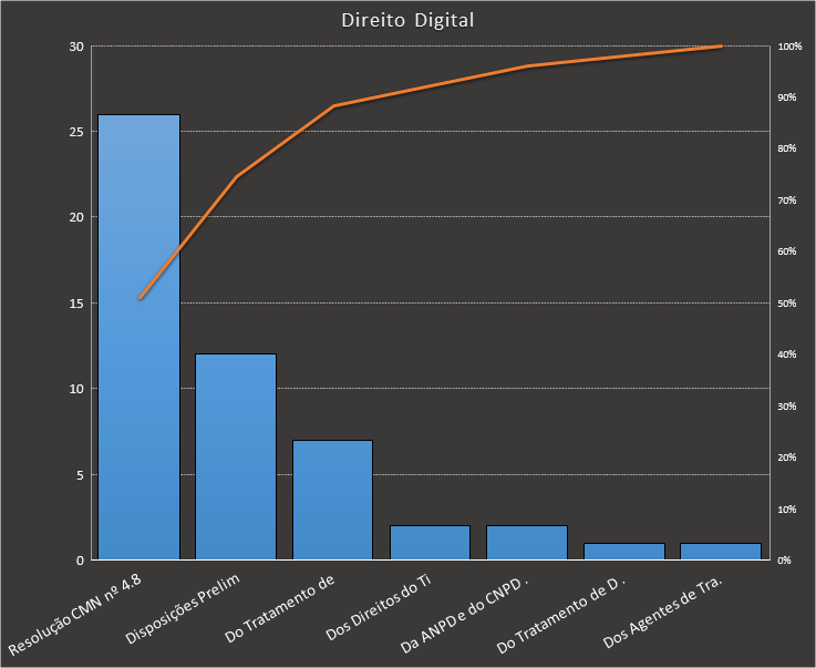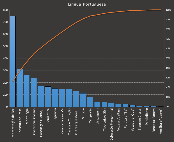 Em todas as tabelas deste artigo destacamos de cor azul os assuntos que atingem porcentagem acumulada de 70%. Para esta matéria em específico, temos destacados de azul 7 tópicos cuja porcentagem acumulada é de 72%. Isso significa que apenas 7 assuntos cobrem 72% de todas as questões da matéria que obedecem aos filtros utilizados. Segue a distribuição.