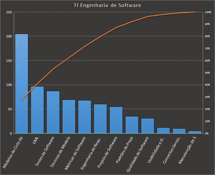 Para TI Engenharia de Software, nos baseamos neste caderno, contendo 734 questões. Usamos como filtro questões da área bancária e financeira. Veja o resultado.