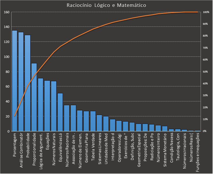 Em Raciocínio Lógico e Matemático, nos baseamos neste caderno, contendo 1.048 questões. Usamos como filtro questões da área bancária e financeira. Veja como ficou a distribuição.
