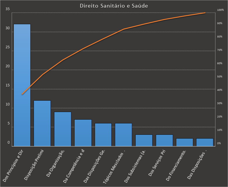 Em Direito Sanitário e Saúde, nos baseamos neste caderno, contendo 82 questões. Usamos como filtro questões de concursos para as forças armadas. Veja como ficou a distribuição.