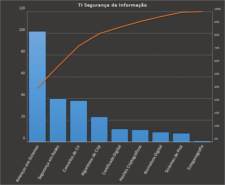 Em TI Segurança da Informação, nos baseamos neste caderno, contendo 244 questões. Usamos como filtro questões de concursos para as forças armadas. Veja como ficou a distribuição.