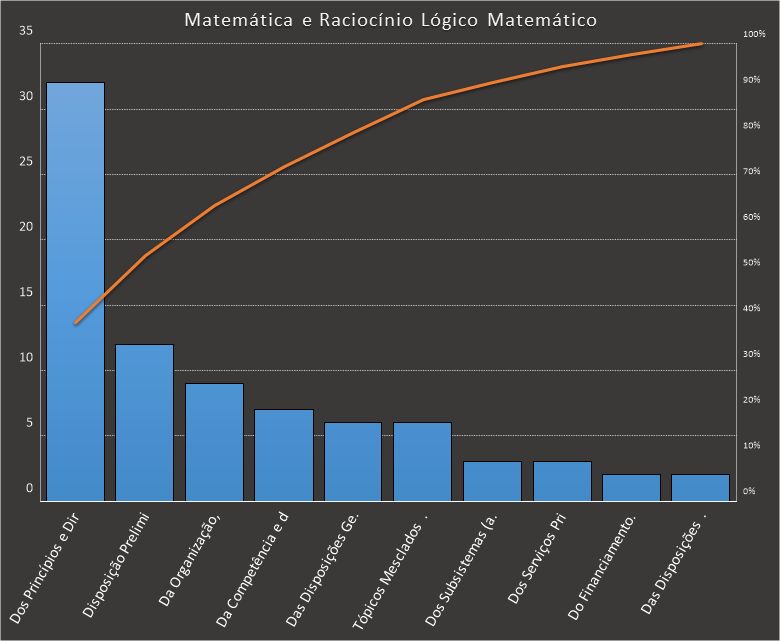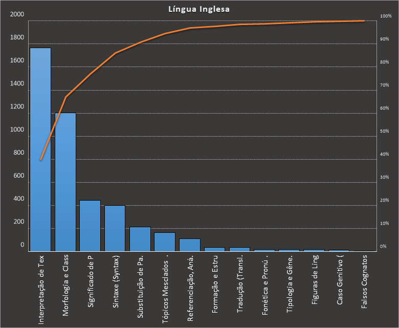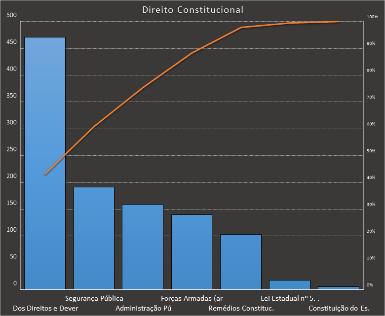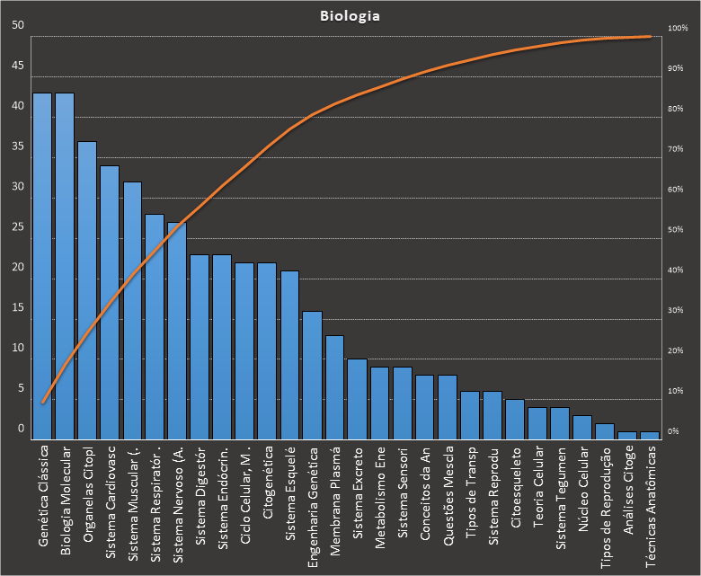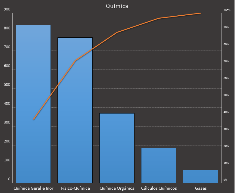 Em todas as tabelas deste artigo destacamos de cor azul os assuntos que atingem porcentagem acumulada de 70%. Para esta matéria em específico, temos destacados de azul 6 tópicos cuja porcentagem acumulada é de 72%. Isso significa que apenas 6 assuntos cobrem 72% de todas as questões da matéria que obedecem aos filtros utilizados. Segue a distribuição.