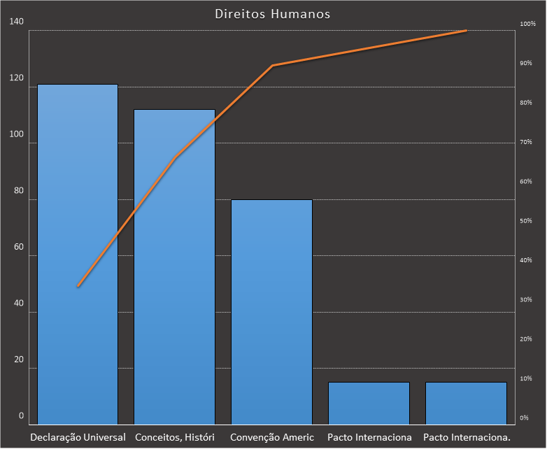 Em Direitos Humanos, nos baseamos neste caderno, contendo 343 questões. Usamos como filtro questões de concursos para as forças armadas. Veja a seguir como ficou a distribuição.