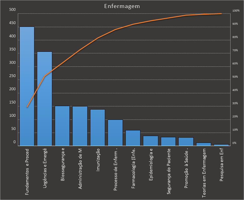 Em Enfermagem, nos baseamos neste caderno, contendo 1.527 questões. Usamos como filtro questões de concursos para as forças armadas. Veja como ficou a distribuição.