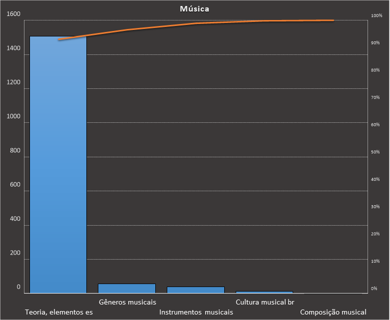Em Música, nos baseamos neste caderno, contendo 1.617 questões. Usamos como filtro questões de concursos para as forças armadas. Veja como ficou a distribuição.