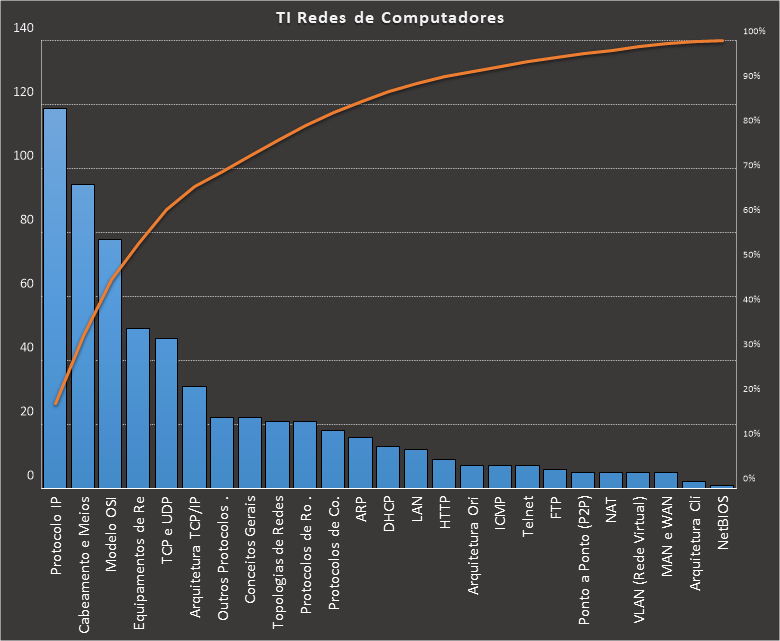 Em TI Redes de Computadores, nos baseamos neste caderno, contendo 625 questões. Usamos como filtro questões de concursos para as forças armadas. Veja como ficou a distribuição.