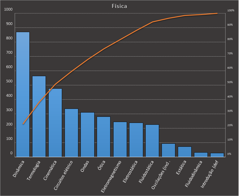 Em Física, nos baseamos neste caderno, contendo 3.769 questões. Usamos como filtro questões de concursos para as forças armadas. Veja como ficou a distribuição.