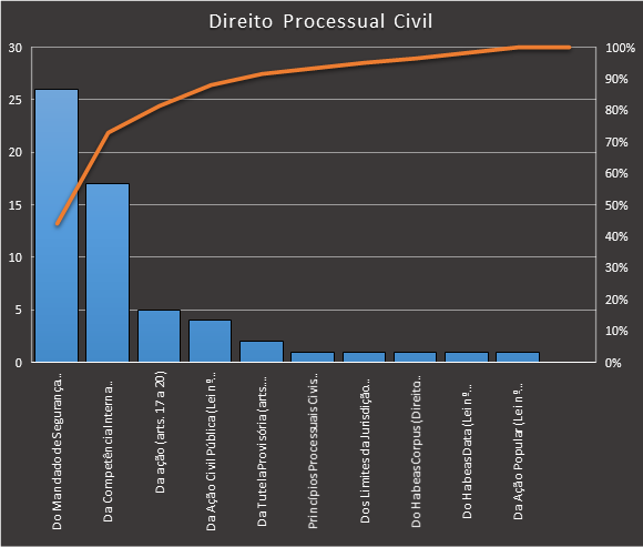 Em Direito Processual Civil, nos baseamos neste caderno: https://www.tecconcursos.com.br/s/Q1Q2lT, contendo 59 questões. Usamos como filtro questões da banca CESPE para área policial. Veja como ficou a distribuição.