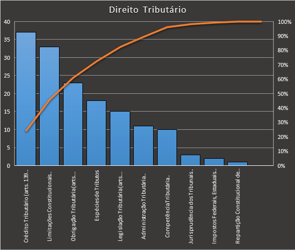 Em Direito Tributário, nos baseamos neste caderno: https://www.tecconcursos.com.br/s/Q1Q2lX, contendo 153 questões. Usamos como filtro questões da banca CESPE para área policial. Veja como ficou a distribuição.