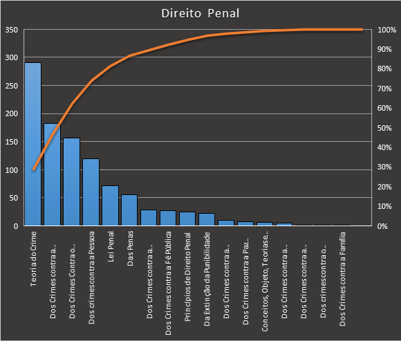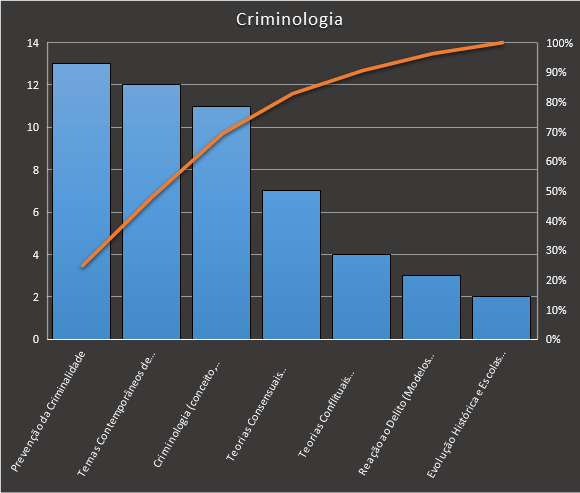 Destacados de azul estão 4 tópico cuja probabilidade acumulada é de 83%. Isso significa que apenas esses 4 tópicos abrangem aproximadamente 83% de todas as questões de criminologia da banca CESPE para área policial, mostrando a importância que a CESPE dá a esses temas, que devem ser priorizados pelos alunos em seus estudos estudos.