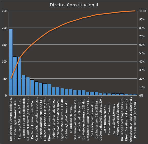 Para esta matéria nos baseamos neste caderno: https://www.tecconcursos.com.br/s/Q1Q2lE, contendo 962 questões. Usamos como filtro questões da banca CESPE para área policial, resultando na distribuição abaixo. Direitos e deveres (artigo 5o), Poder legislativo, Segurança pública e Controle de constitucionalidade abarcam metade de todas as questões.
