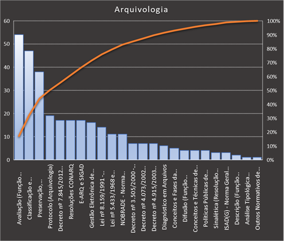 Destacados de azul estão 8 tópicos cuja probabilidade acumulada é de 71%. Isso significa que esses 8 tópicos são os assuntos mais cobrados, representando 71% de todas as questões de Arquivologia que obedecem aos filtros empregados. O destaque vai para o assunto “Avaliação (Função Arquivística)”, que sozinho corresponde a 17% das questões.
