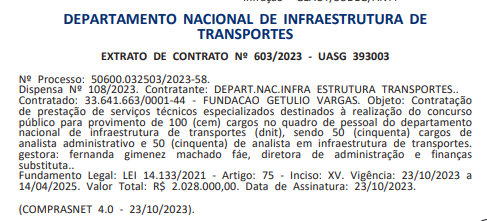 O resultado final do curso de formação do concurso do DNIT foi publicado.