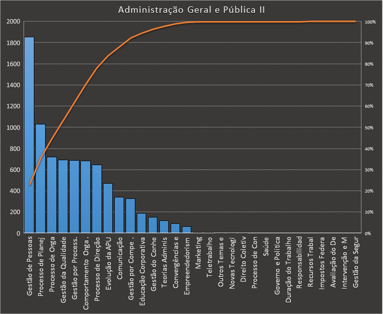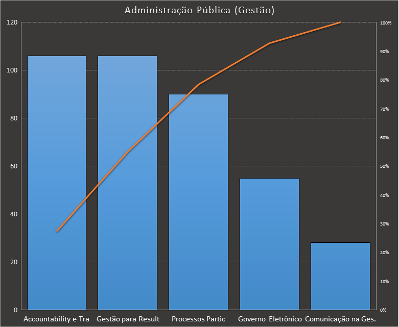 O caderno base contou com 385 questões. Usamos como filtros questões elaboradas pela banca CEBRASPE. Como resultado, Accountability e Transparência e Gestão para Resultados somam mais da metade de todas as questões.