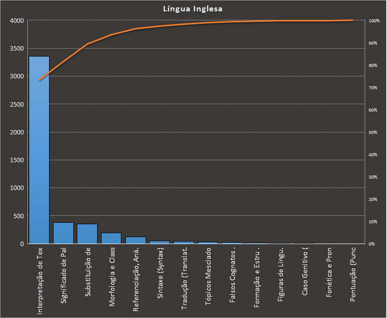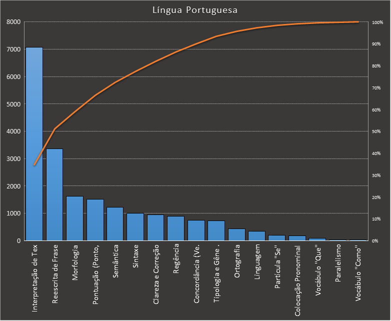 Em Língua Portuguesa, nos baseamos neste caderno, contendo 20.440 questões. Usamos como filtros questões elaboradas pela banca CEBRASPE. Na tabela abaixo, assim como em todas as análises deste artigo, destacamos em azul os tópicos que atingem uma porcentagem acumulada de 70%. Para esta disciplina em específico, cinco tópicos alcançam uma porcentagem acumulada de 72%. Veja a seguir como ficou a distribuição.