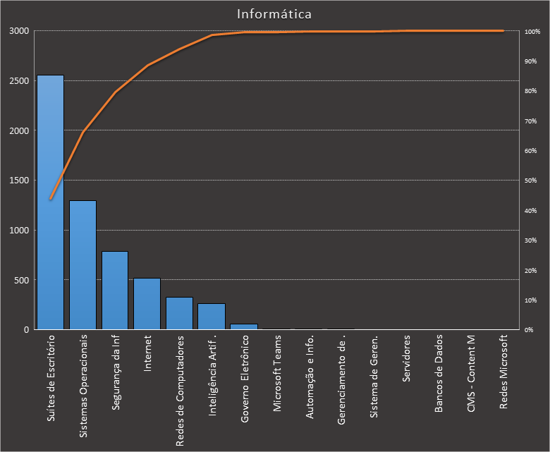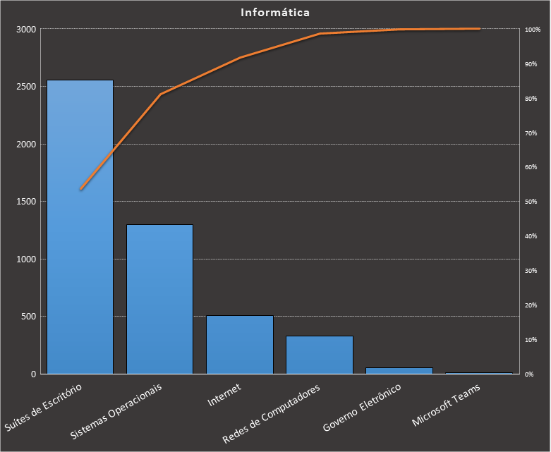 Em Informática, nos baseamos neste caderno, contendo 5.840 questões. Usamos como filtros questões elaboradas pela banca CEBRASPE. Veja como ficou a distribuição.