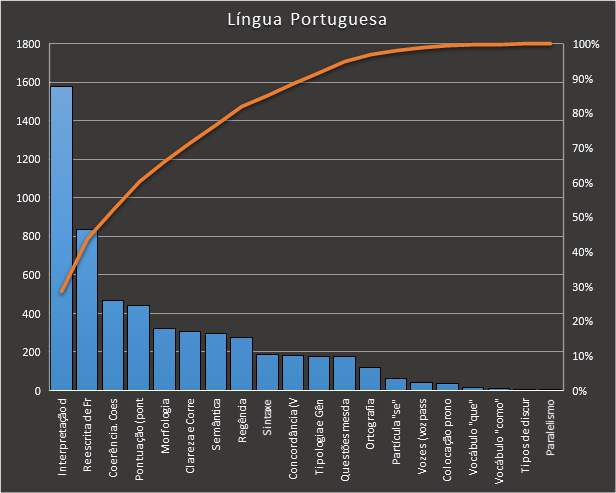 O tópico mais cobrado é interpretação de textos. Esse assunto sozinho corresponde a 29% de todas as questões. Este e o tópico "reescrita de frases e substituição de trechos" abrangem mais de dois quintos de todas as questões. Segue a distribuição.