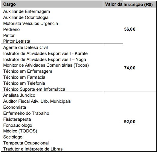 Os valores da taxa de inscrição variam de R$ 56 a R$ 72. Veja o detalhamento na imagem abaixo: