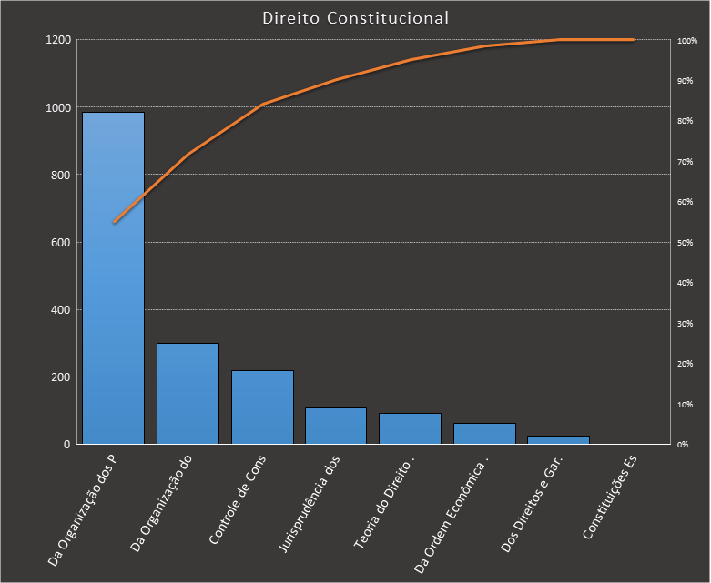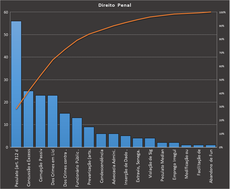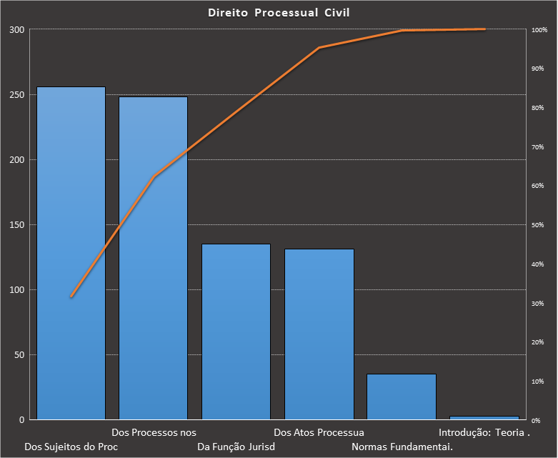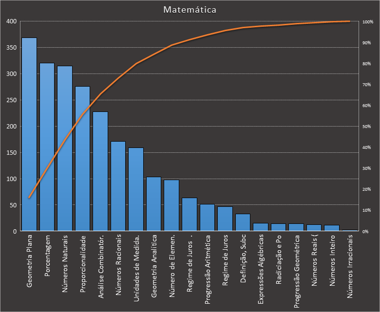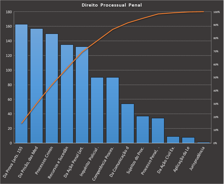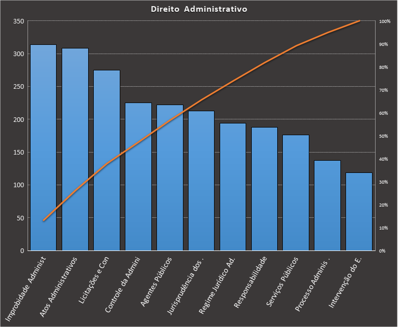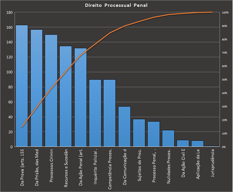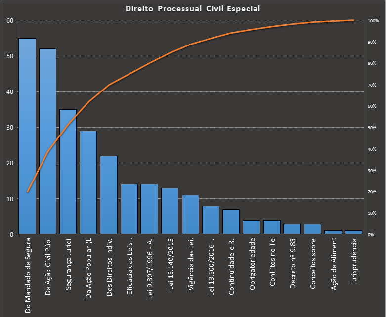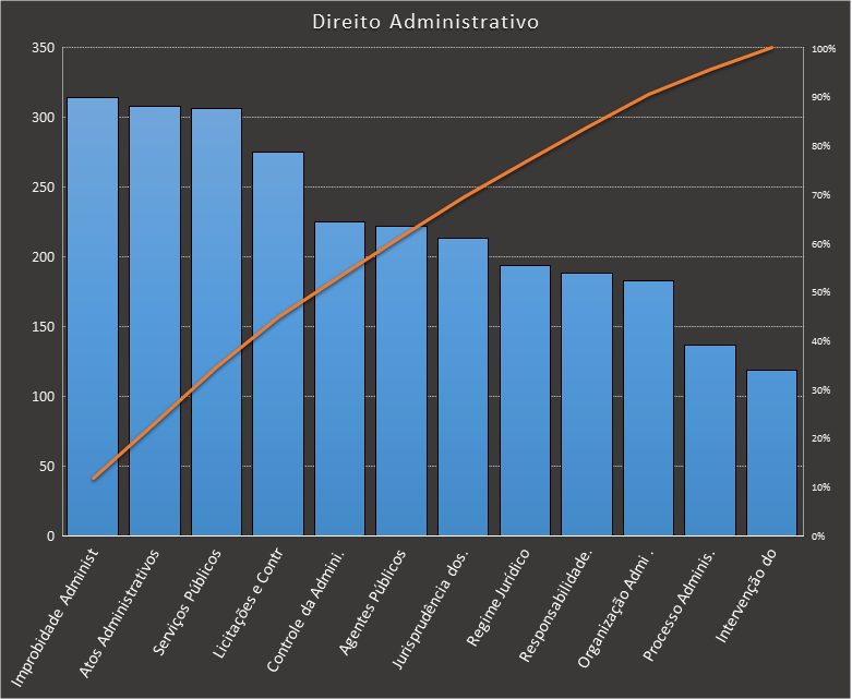 Em todas as tabelas deste artigo destacamos de cor azul os assuntos que atingem porcentagem acumulada de 70%. Para esta matéria em específico, temos destacados de azul 4 tópicos cuja porcentagem acumulada é de 71%. Isso significa que apenas 4 assuntos cobrem 71% de todas as questões da matéria que obedecem aos filtros utilizados. Segue a distribuição.