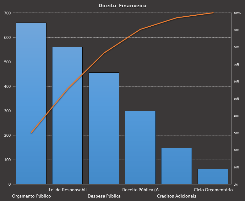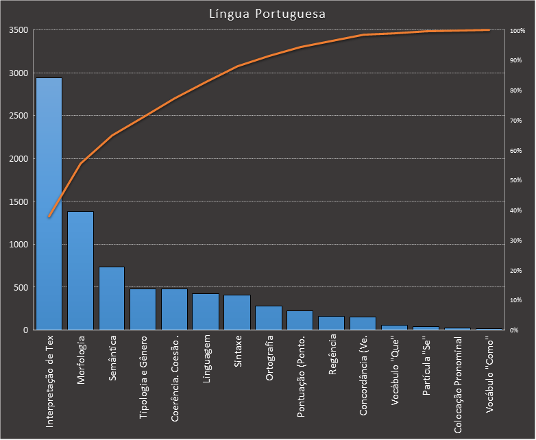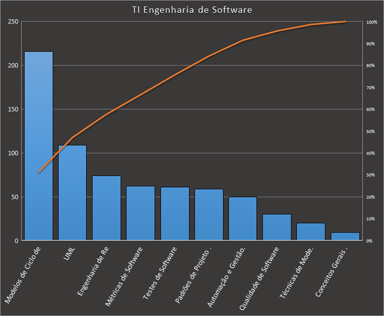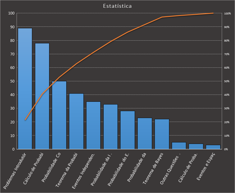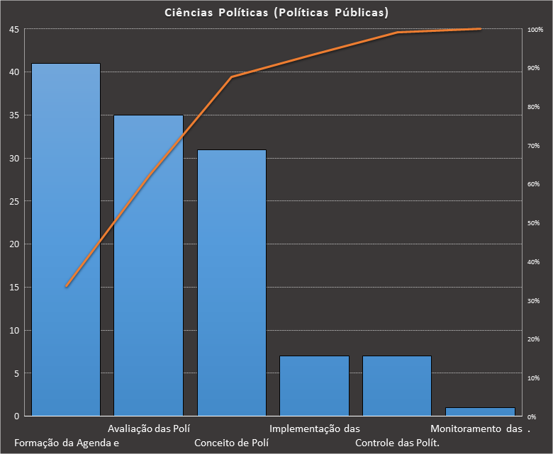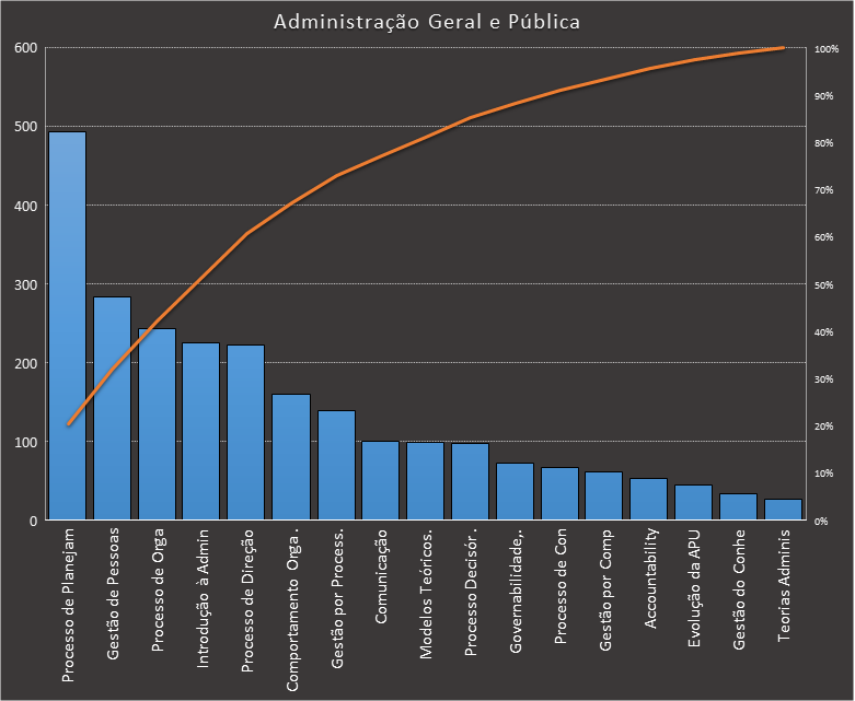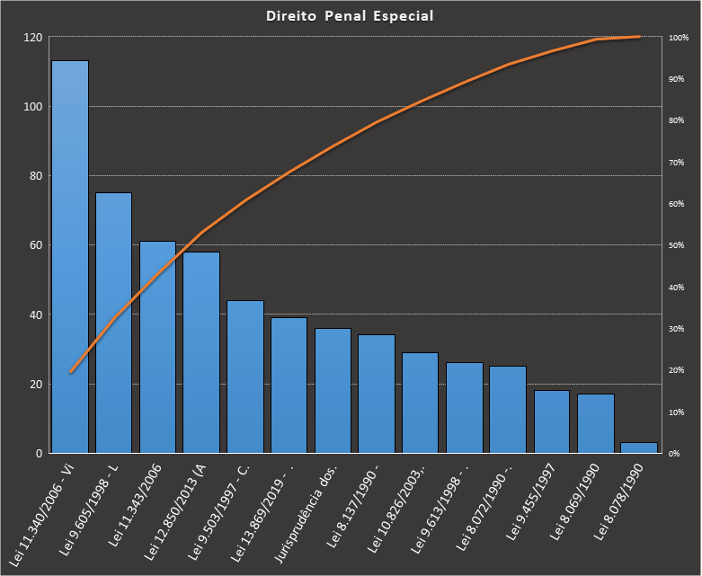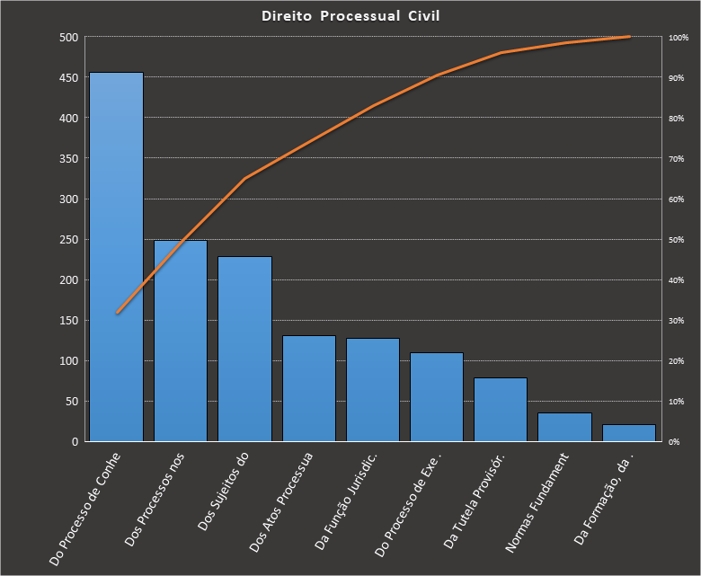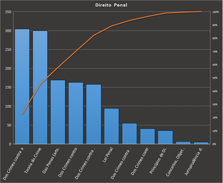 Em todas as tabelas deste artigo destacamos de cor azul os assuntos que atingem porcentagem acumulada de 70%. Para esta matéria em específico, temos destacados de azul 4 tópicos cuja porcentagem acumulada é de 71%. Isso significa que apenas 4 assuntos cobrem 71% de todas as questões da matéria que obedecem aos filtros utilizados. Segue a distribuição.