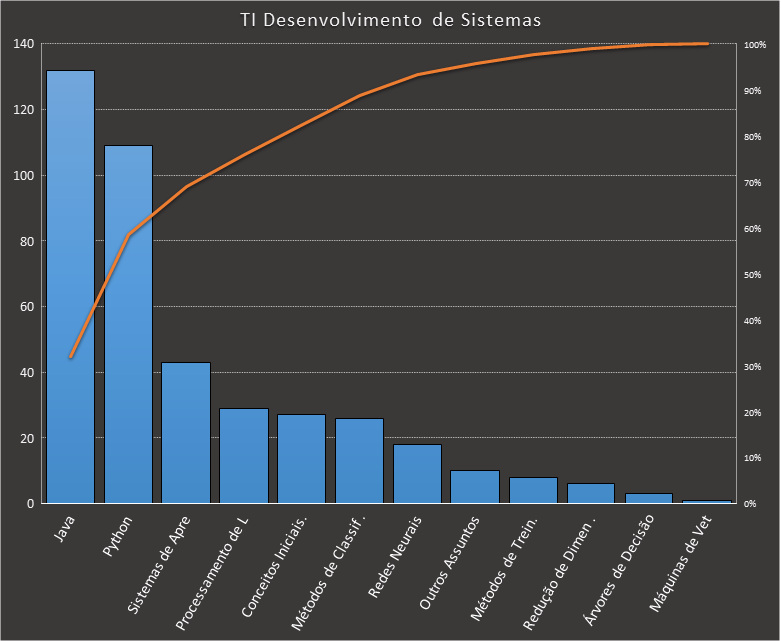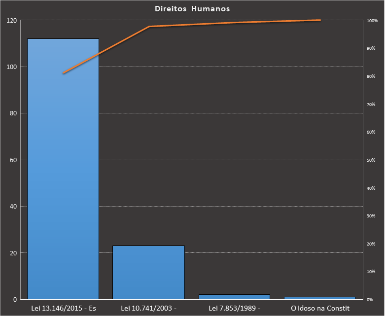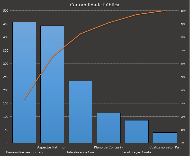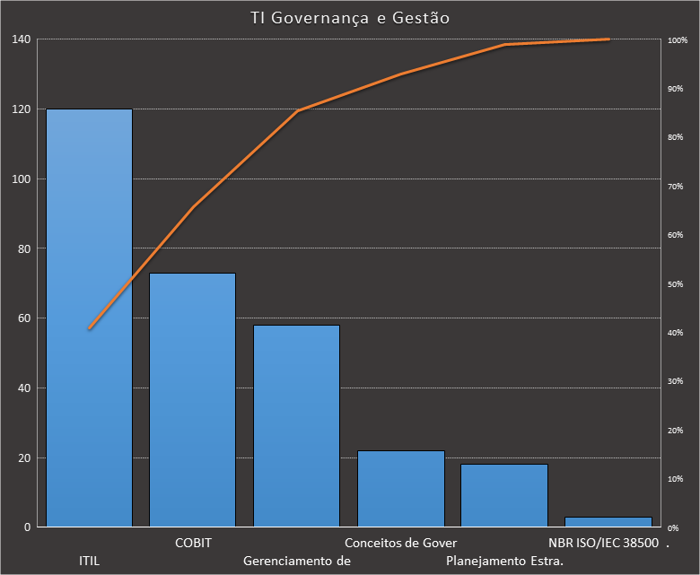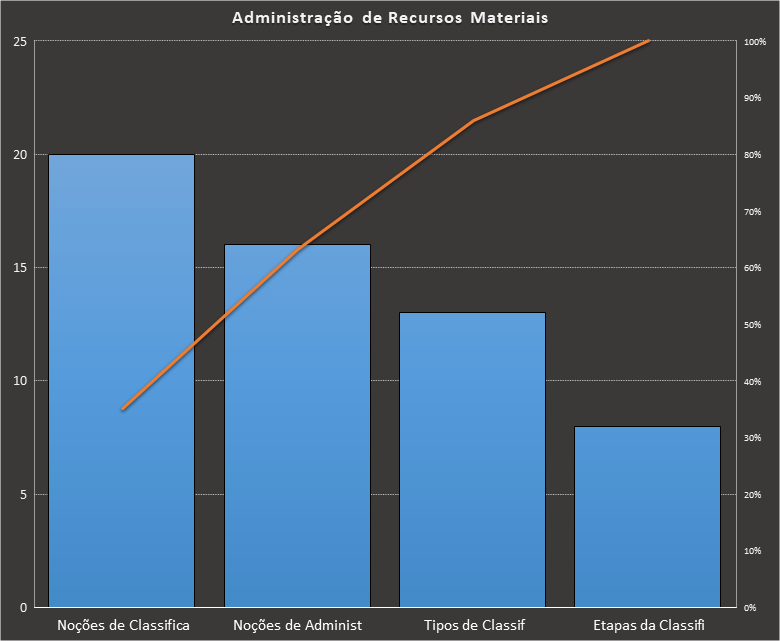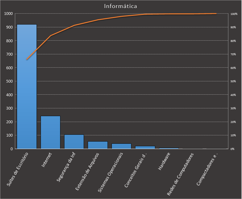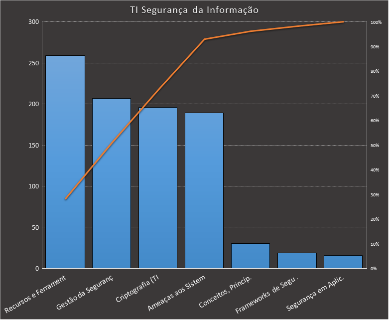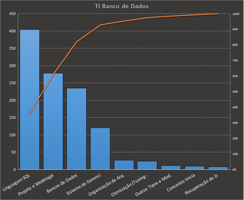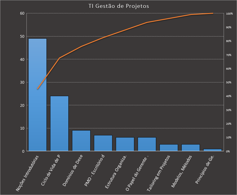 Em todas as tabelas deste artigo destacamos de cor azul os assuntos que atingem porcentagem acumulada de 70%. Para esta matéria em específico, temos destacados de azul 4 tópicos cuja porcentagem acumulada é de 71%. Isso significa que apenas 4 assuntos cobrem 71% de todas as questões da matéria que obedecem aos filtros utilizados. Segue a distribuição.