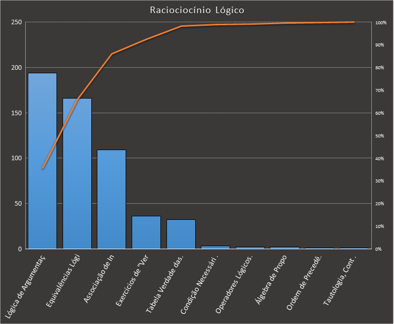 O caderno base contou com 546 questões. Usamos como filtros questões elaboradas pela FGV. Como resultado, lógica de argumentação e equivalência lógica somam mais da metade de todas as questões, como mostra a distribuição a seguir: