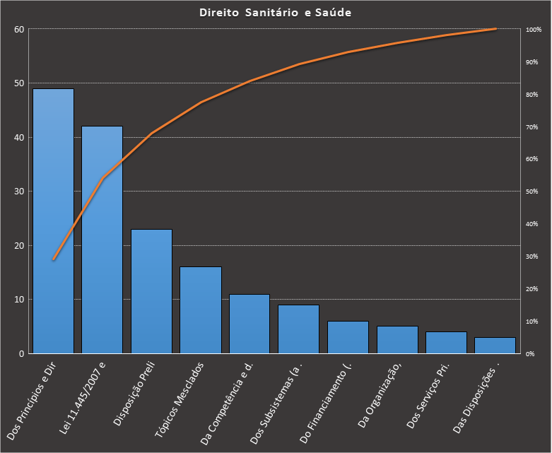 Em Direito Sanitário e Saúde, nos baseamos neste caderno, contendo 168 questões. Usamos como filtros questões elaboradas pela FGV. Veja como ficou a distribuição.