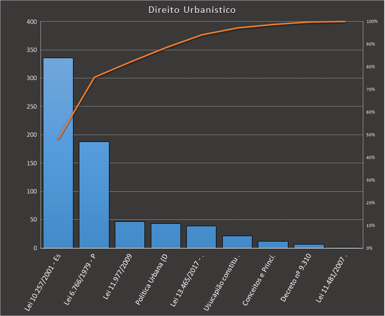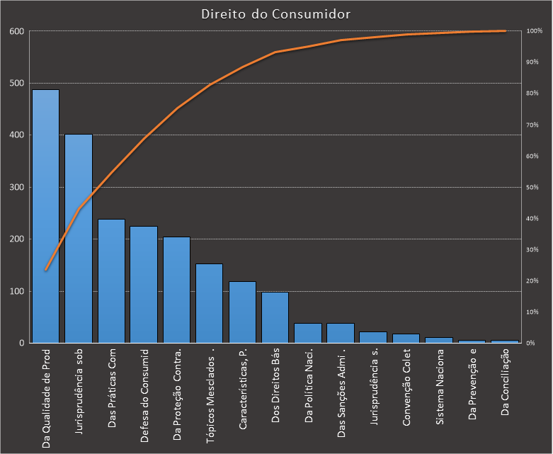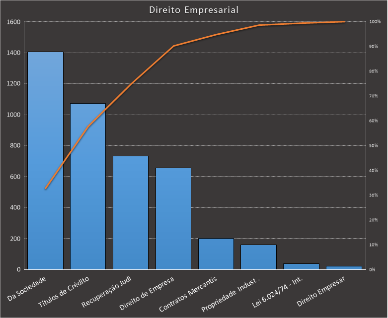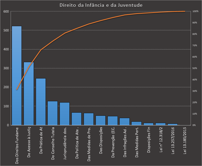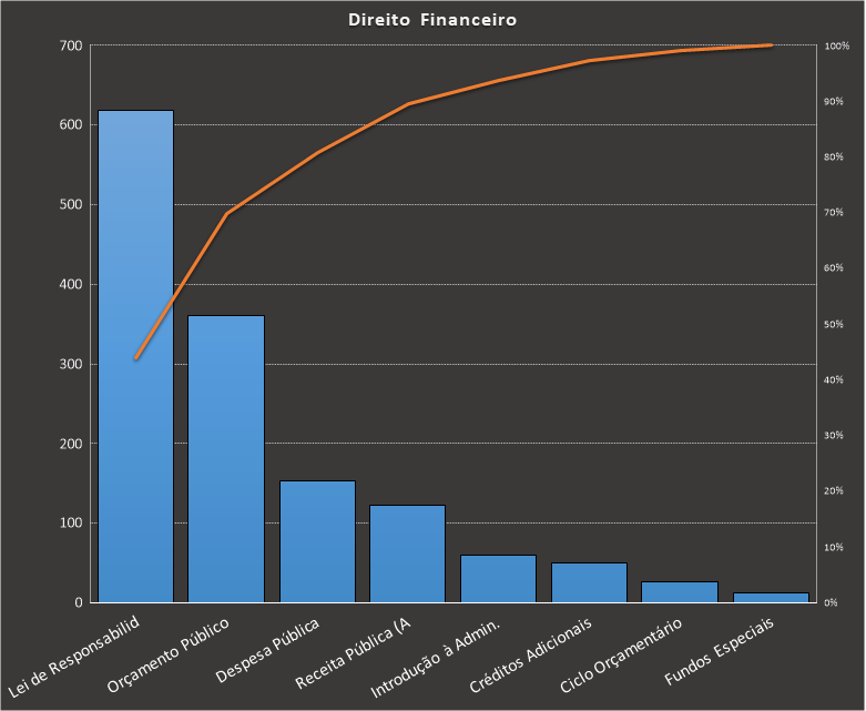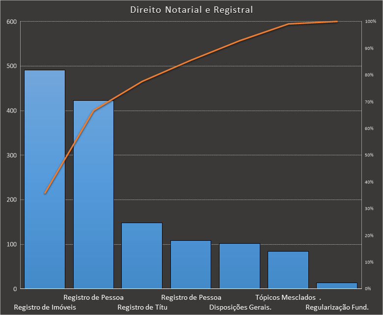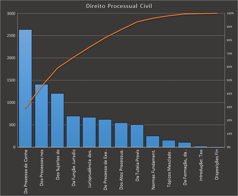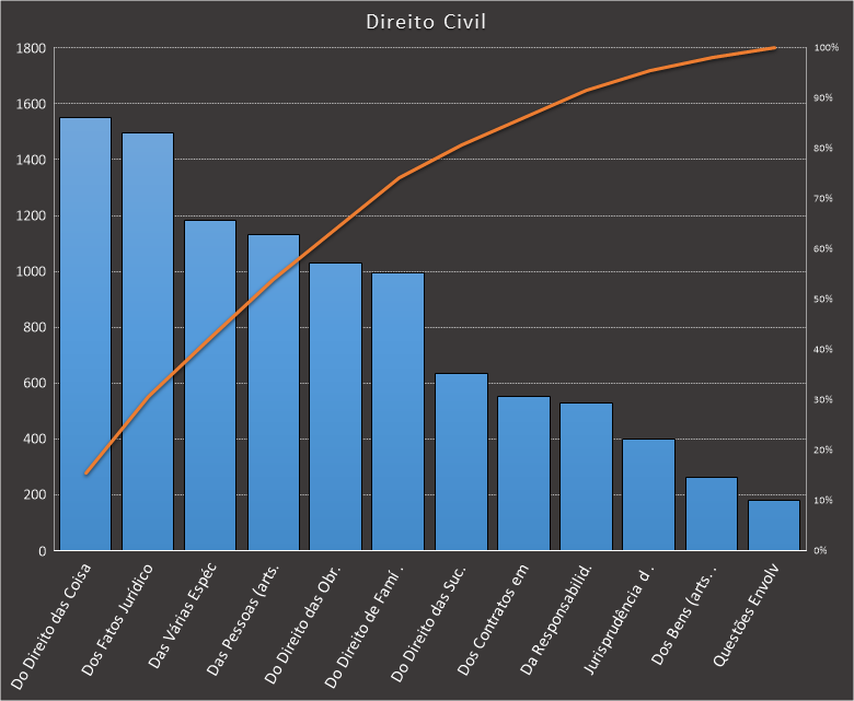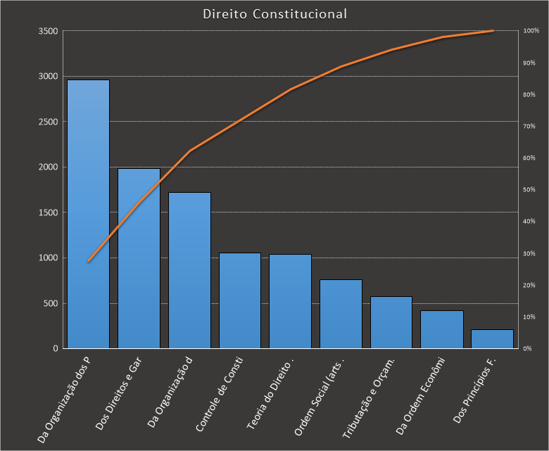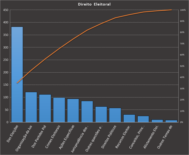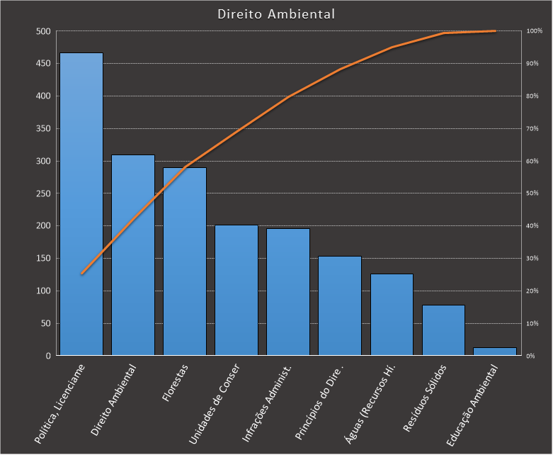 Em todas as tabelas deste artigo destacamos de cor azul os assuntos que atingem porcentagem acumulada de 70%. Para esta matéria em específico, temos destacados de azul 6 tópicos cuja porcentagem acumulada é de 76%. Isso significa que apenas 6 assuntos cobrem 76% de todas as questões da matéria que obedecem aos filtros utilizados. Segue a distribuição.