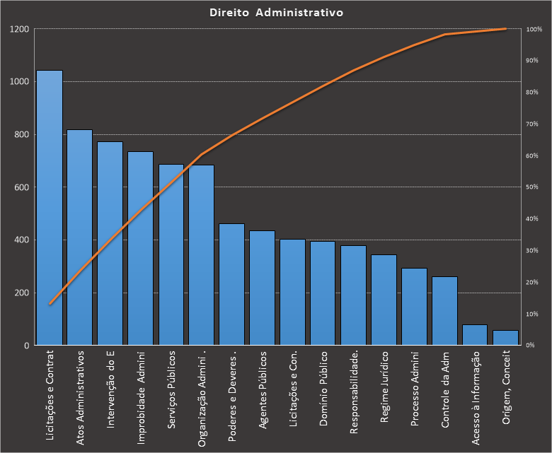 Em Direito Administrativo, nos baseamos neste caderno, contendo 7.848 questões. Usamos como filtros questões para autoridades da área jurídica. Veja como ficou a distribuição.