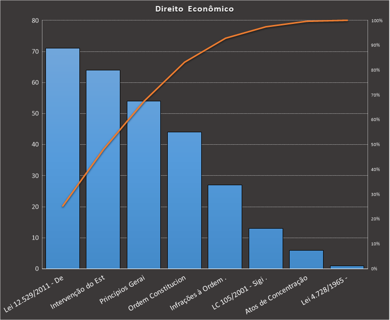 Em Direito Econômico, nos baseamos neste caderno, contendo 280 questões. Usamos como filtros questões para autoridades da área jurídica. Veja como ficou a distribuição.