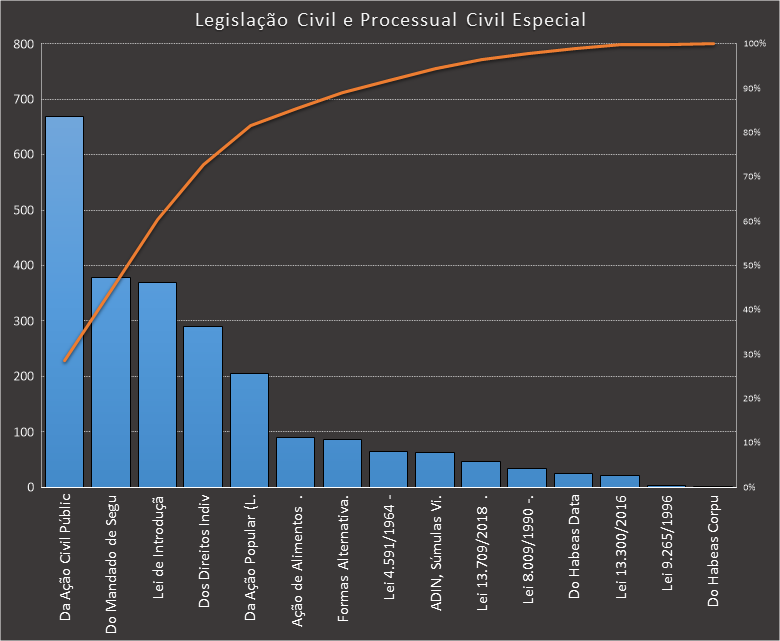 O caderno base contou com 1.089 questões. Usamos como filtros questões para autoridades da área jurídica. A distribuição é esta: