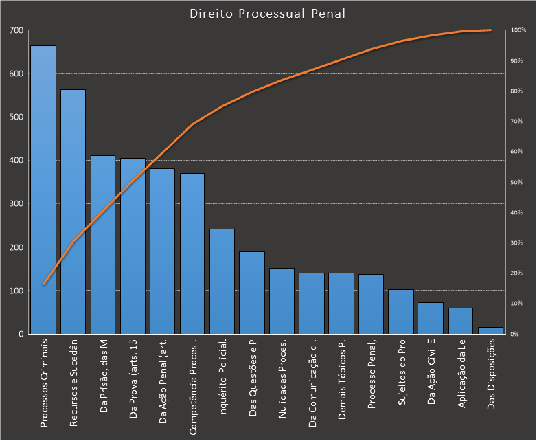 Em Direito Processual Penal, nos baseamos neste caderno, contendo 4.040 questões. Usamos como filtros questões para autoridades da área jurídica. Como resultado, processos criminais em espécie é o assunto mais cobrado e representa 16% das questões. Veja a distribuição: